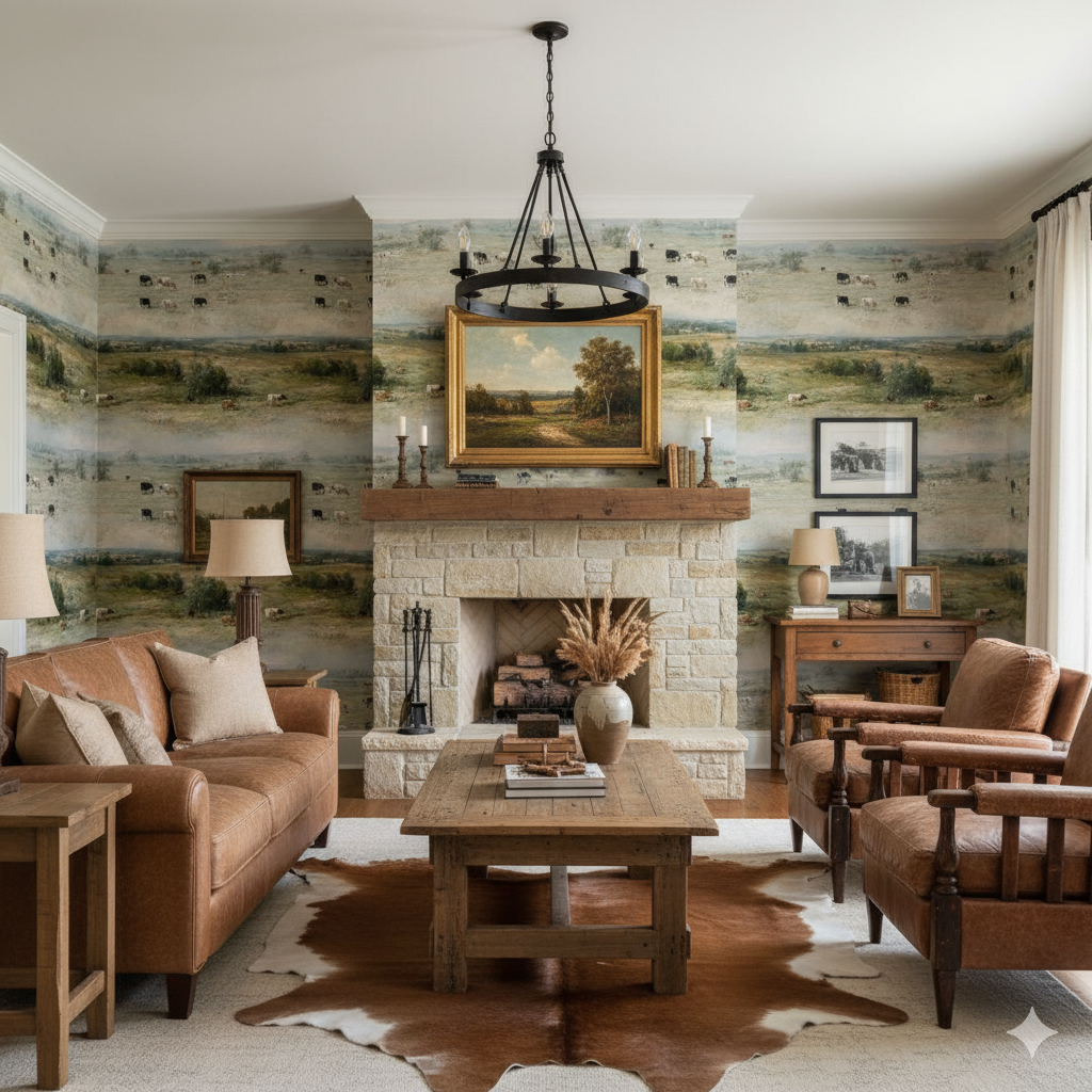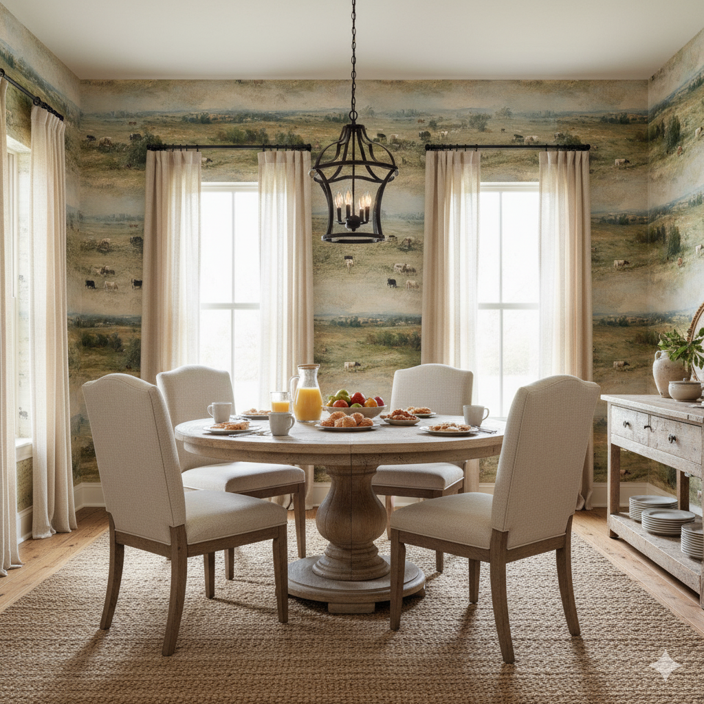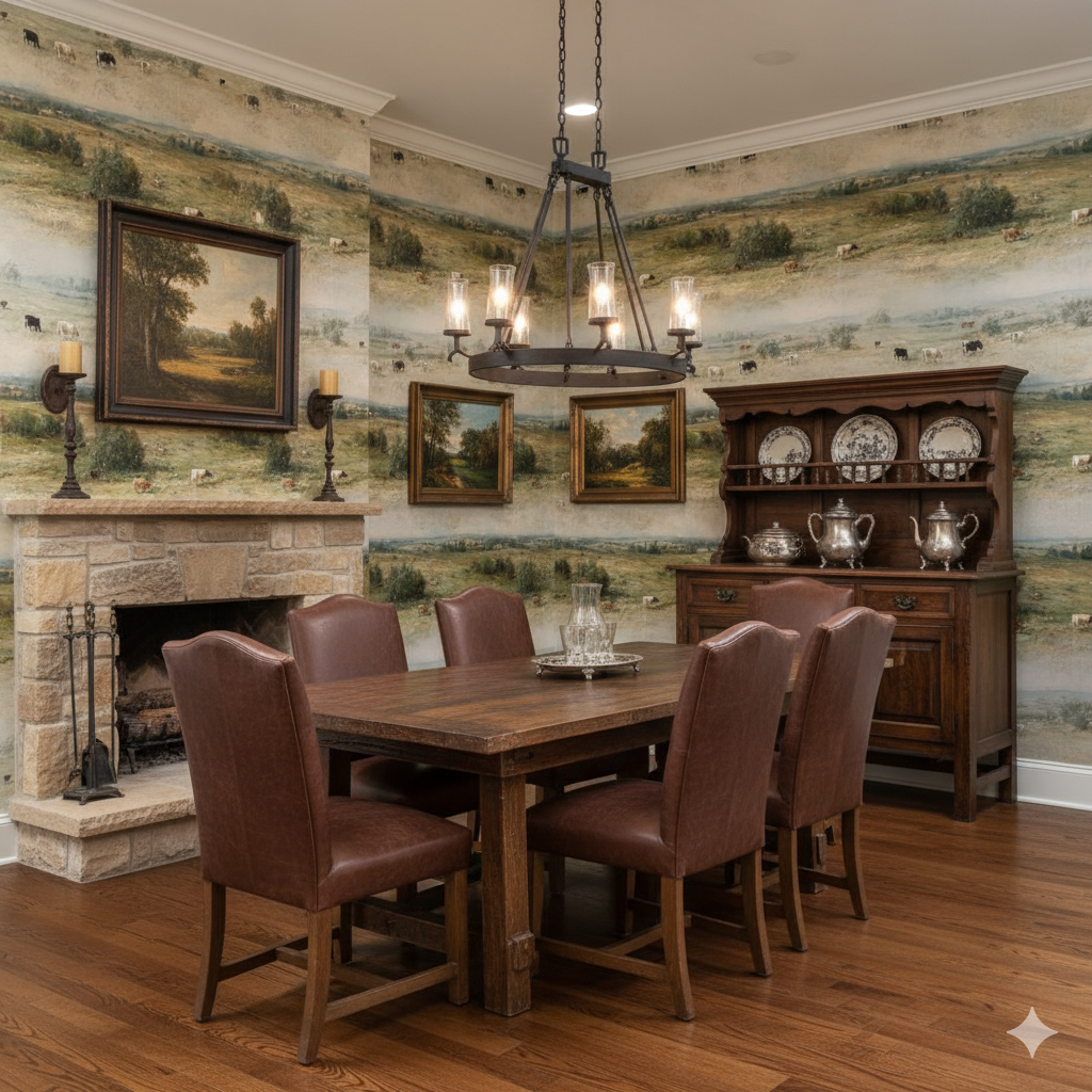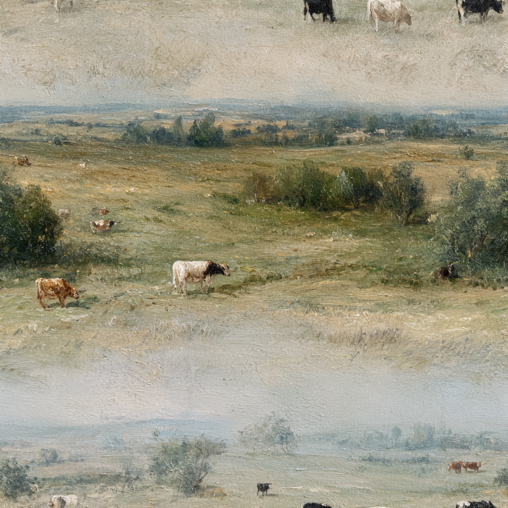 A sweeping pastoral scene of cows grazing under pale skies, painted in muted strokes of green, beige, and blue-gray. This wallpaper brings the tranquility of farmland indoors, with layers of depth that mimic an oil painting across the wall. It’s a perfect choice for country homes, farmhouse kitchens, or even modern interiors that want a touch of heritage storytelling. Each section feels like a panoramic view, carrying with it the scent of hay and the calm of rolling hills. Ideal for creating a cozy, lived-in warmth in dining rooms or studies.
