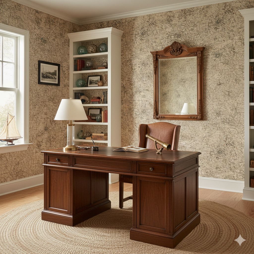 A dense map-inspired print featuring intricate star charts and antique cartography, rendered in sepia, ink black, and faded blue. The concentric circles and fine script give the impression of aged parchment filled with celestial knowledge. This wallpaper is a dream for study walls, libraries, or offices where history and exploration are central themes. It brings gravitas and intellectual charm, like an old world map brought to life in mural form. Pair with leather-bound books, brass lamps, and dark wood furnishings to complete the scholarly atmosphere, or juxtapose it with sleek contemporary furniture for a striking conversation between past and present.