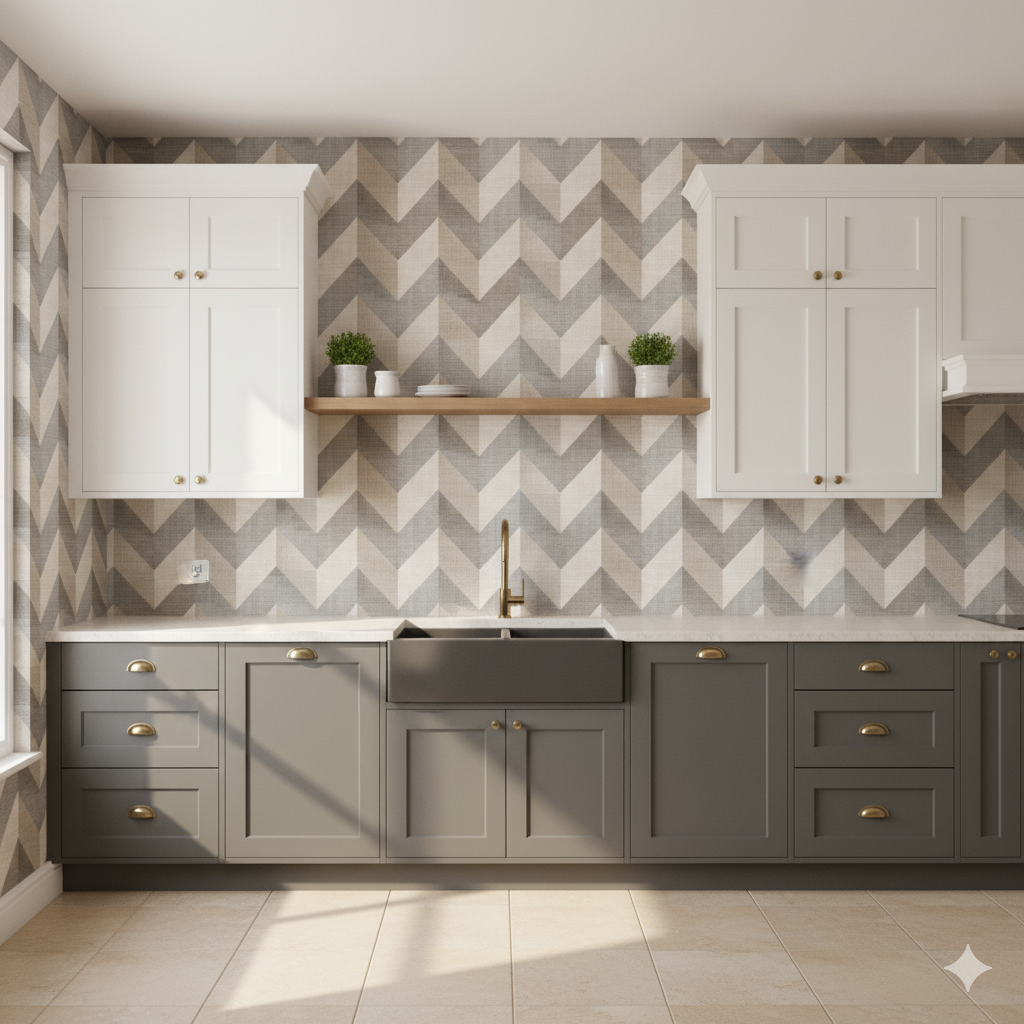 Meridian Weave offers a geometric chevron rendered in layered tones of gray, taupe, and ivory, with a subtle woven-linen texture overlay. The effect is contemporary yet grounded, adding visual depth without being overly bold. This wallpaper thrives in spaces like living rooms, offices, or bedrooms that call for a structured, modern feel with warmth. Its understated palette allows it to complement both dark woods and sleek metals, while its textile-inspired finish creates a tactile sense of comfort. Think of it as the wallpaper equivalent of a tailored suit: clean, versatile, and endlessly stylish.