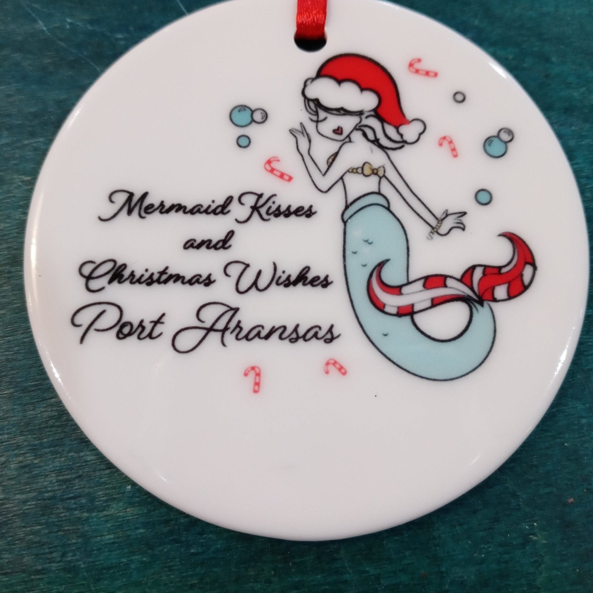 Celebrate a coastal Christmas with our charming "Mermaid Kisses & Christmas Wishes" ornament. This delightful piece perfectly captures the magic of the holiday season in Port Aransas, Texas, making it an ideal keepsake for anyone who treasures the sandy shores of this beloved island. Hang this ornament on your tree and let it transport you to warm beach days every holiday season.