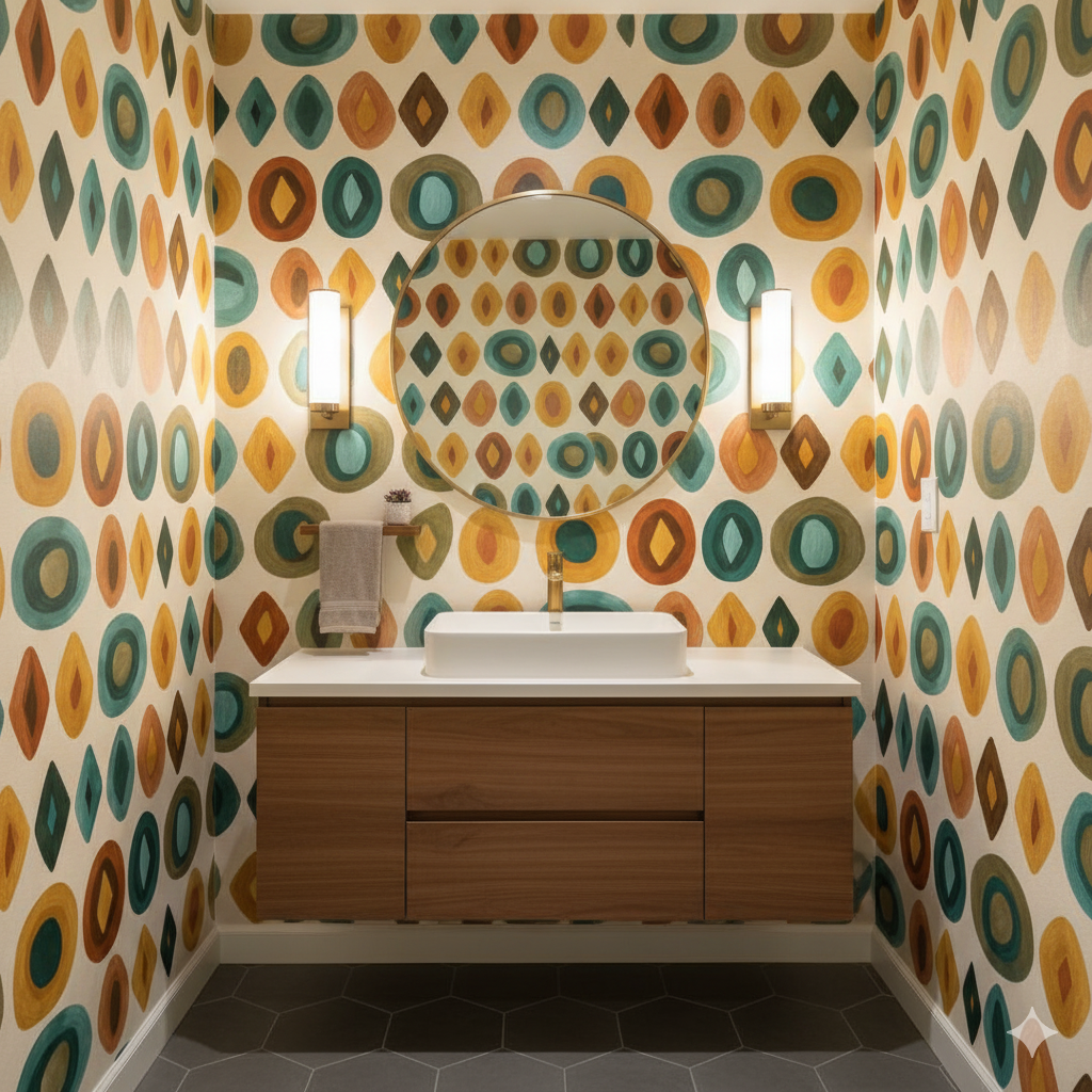 Playful yet sophisticated, this geometric wallpaper showcases repeating circles, diamonds, and ovals in an earthy desert-inspired palette of turquoise, sienna, mustard yellow, olive green, and rust orange. The painterly brushwork softens the sharpness of the forms, giving the design a handcrafted, mid-century modern feel. This wallpaper is a versatile choice for accent walls in offices, retro-inspired living rooms, or eclectic cafes. Its rhythmic structure makes it bold enough to stand out, while the natural colors keep it grounded and warm.