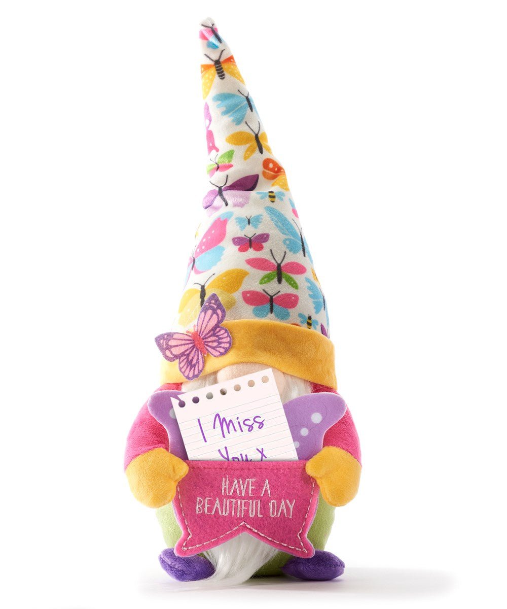 HAVE A BEAUTIFUL DAY. Soft plush gnome styled with a butterfly print hat, dressed in bright colors and features a simple inspirational sentiment on a stitched purple & pink butterfly pocket. Ideal for holding a gift card or a special note.