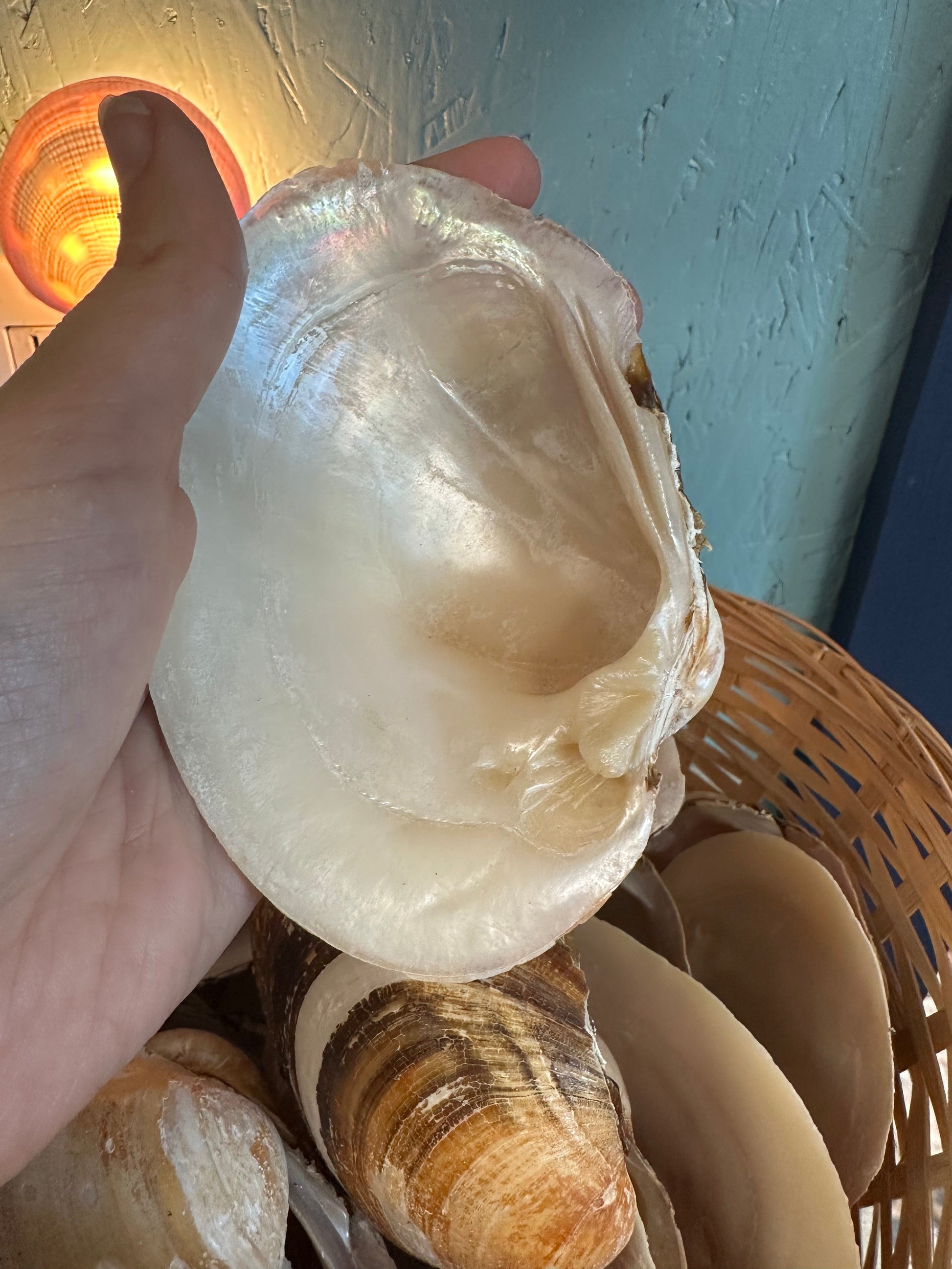 The Large Mexican River Clam is a versatile and unique addition to any collection. Measuring at approximately 4-5", these clams boasts a vibrant pearl sheen inside and a partially raw back, making it perfect for use as a trinket dish or as a beautiful centerpiece for projects and crafts. Don't miss out on this stunning specimen!
