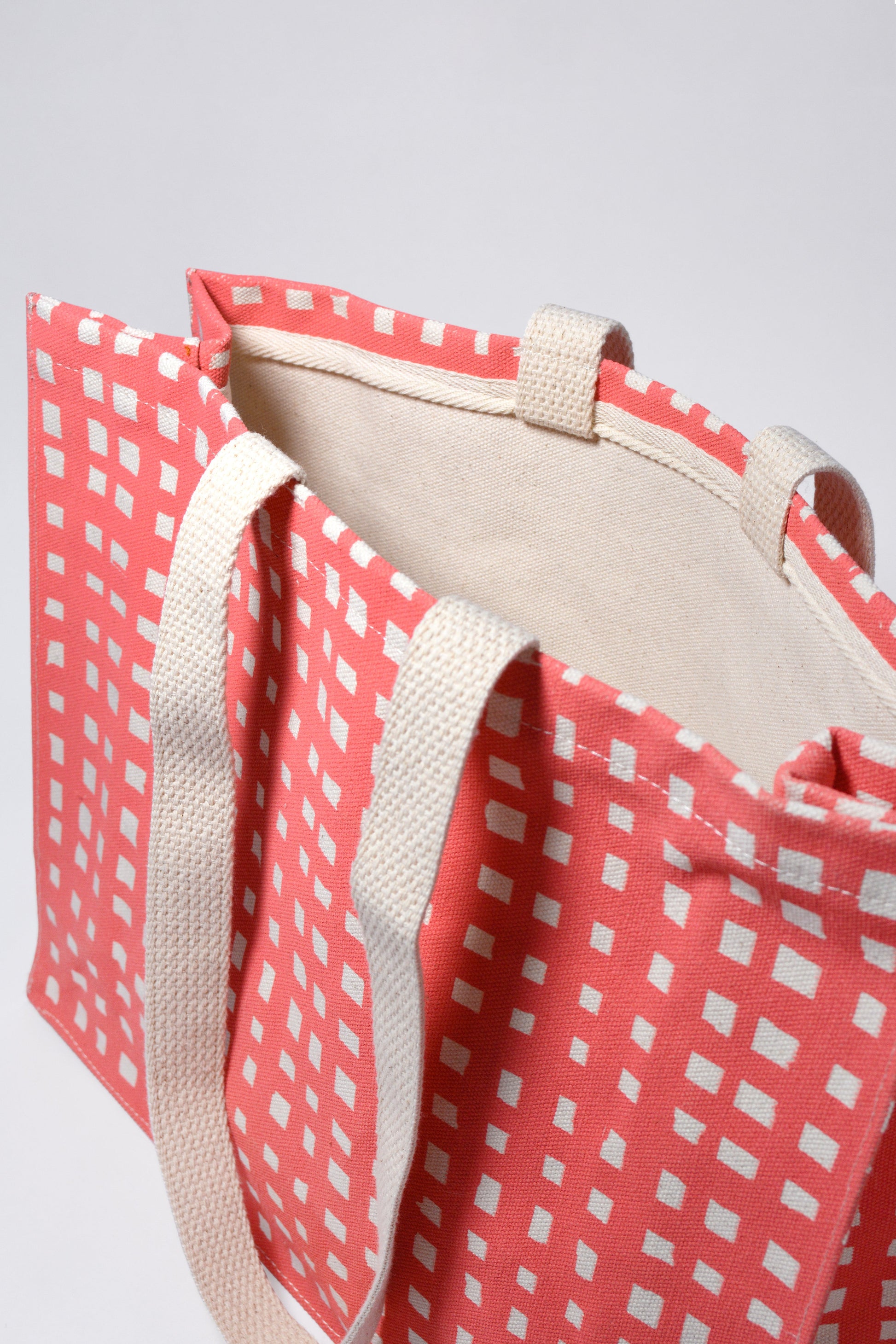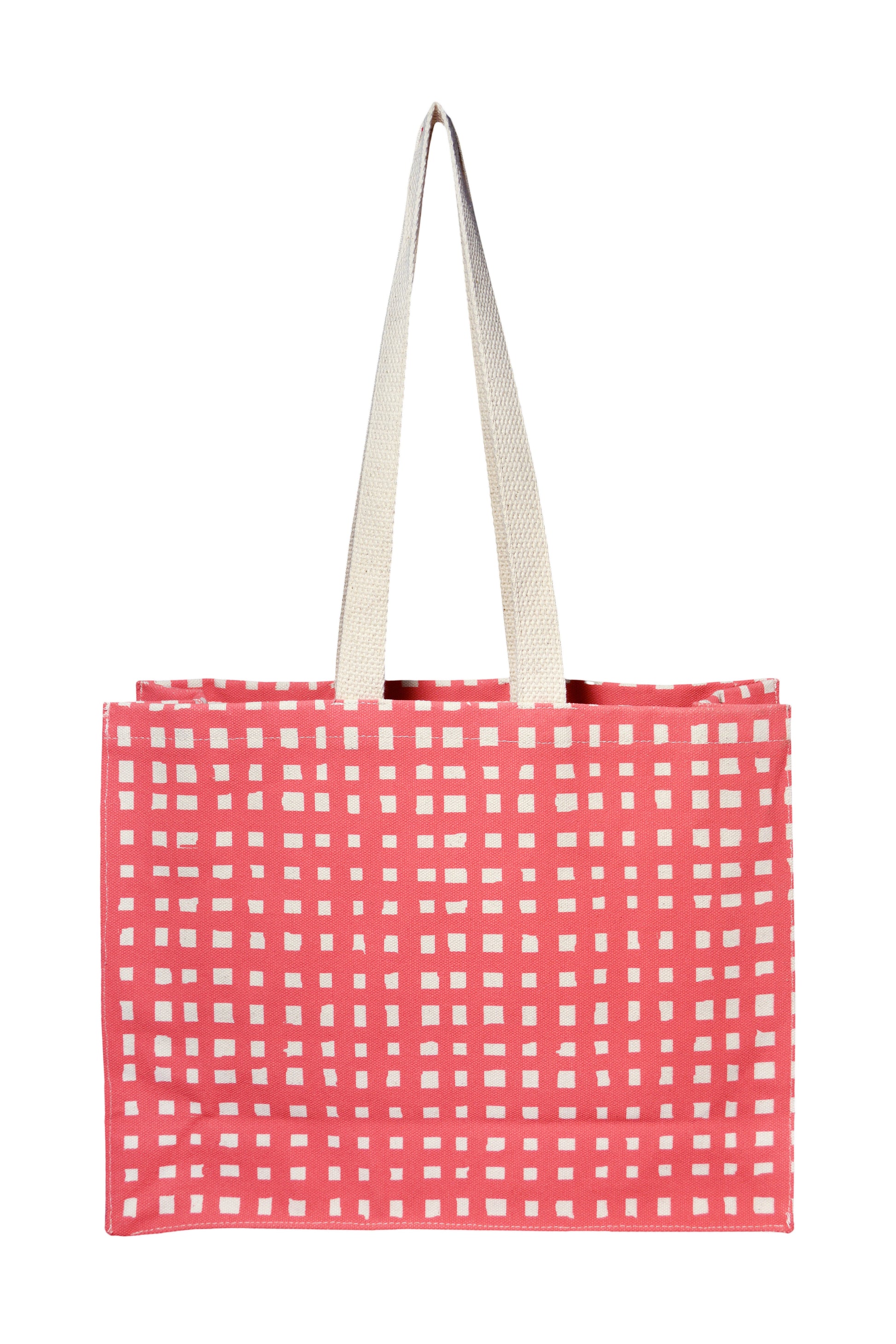 A smaller take on our shopper tote. Perfect size for your laptop, books, and other work essentials or for a quick trip to the store. Sturdy, structured, and reusable cotton canvas shopper bag featuring a hand drawn grid pattern screenprinted in coral.