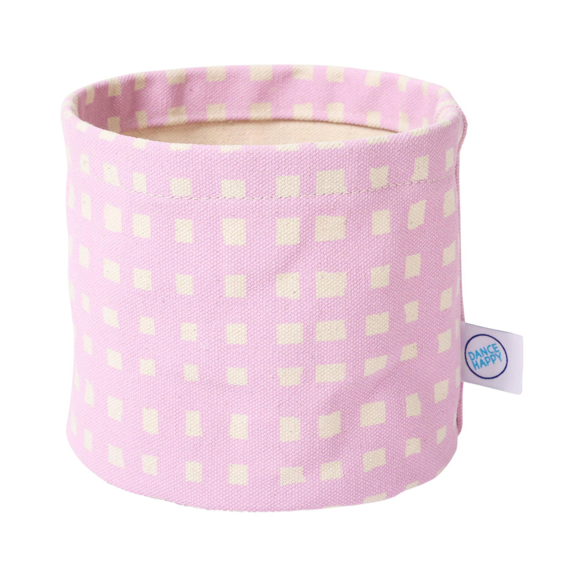 Round cotton bin/canvas planter featuring a hand-drawn micro grid pattern screenprinted in lilac. Perfect for home organizing or a potted plant to add a touch of fun to any space. If using as a planter, simply insert a plastic liner, place any potted plant inside the canvas planter, and voila: goodbye boring generic pot, hello fun home decor! These round bins/canvas planters are made from a durable cotton canvas that stands upright on their own.
