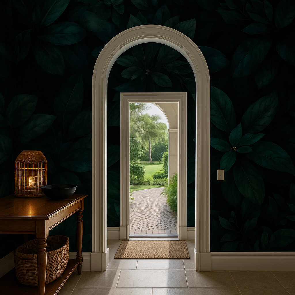 Moody and dramatic, "Midnight Botanica" brings the mysterious beauty of a forest at dusk to your walls. Oversized leaves in rich emerald, deep teal, and shadowy green stretch across an inky black background, creating an immersive and lush botanical escape. Subtle detailing in the veins and petals adds sophistication and depth. Perfect for statement walls, luxurious bedrooms, or dramatic dining spaces.