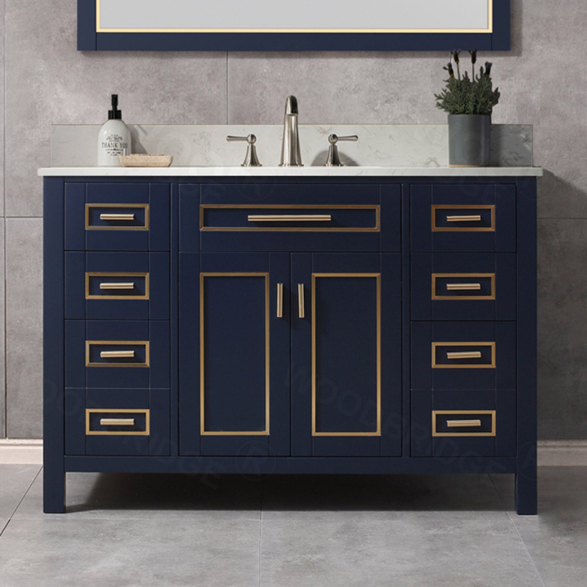 Milan 49” Floor Mounted Single Basin Vanity Set with Solid Wood Cabinet in Navy Blue and Engineered stone composite Vanity Top in Carrara White with Pre-installed Undermount Rectangle Bathroom Sink and Pre-Drilled 3-Hole for 8-inch Widespread Faucet