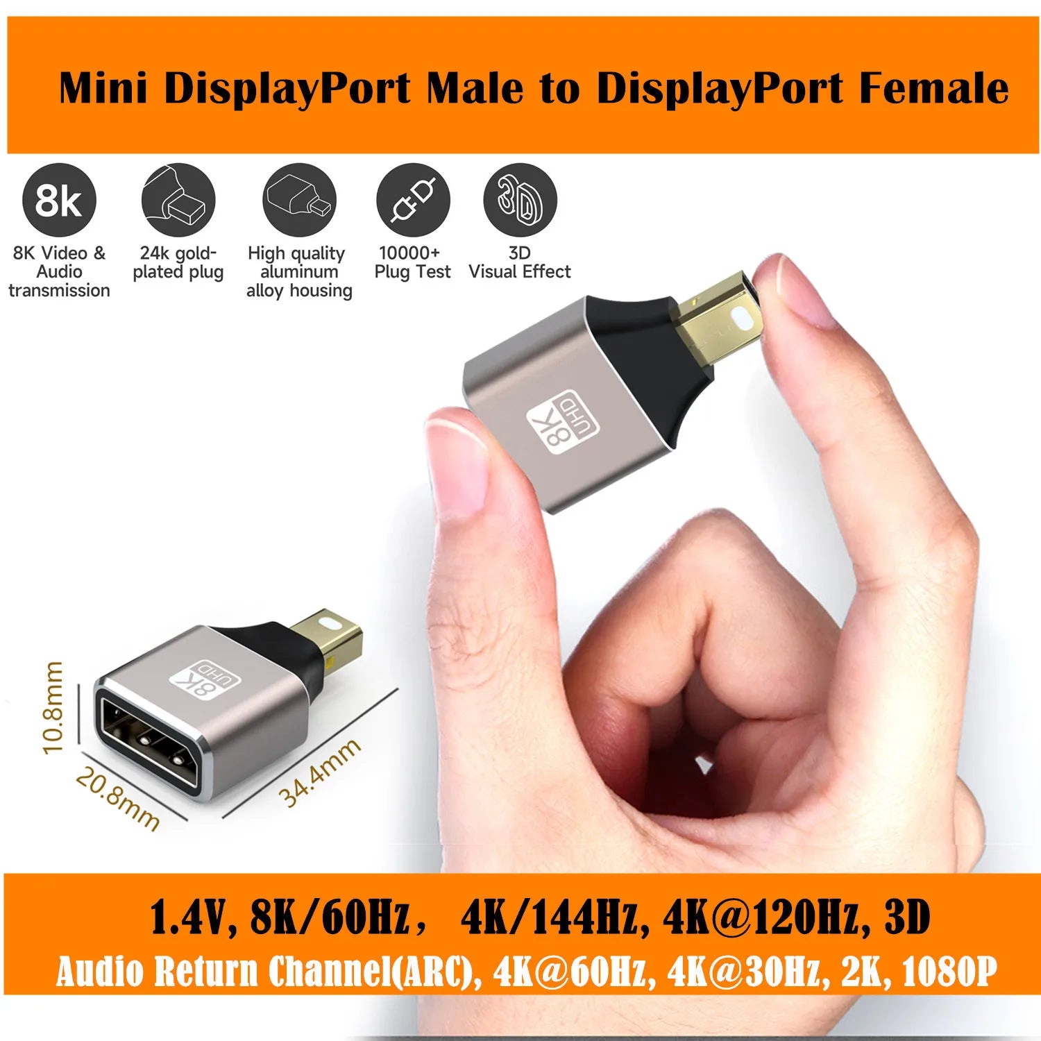 DisplayPort 1.4,Ultra HD 8K Video,Games and Picture Experiences,the Mini DisplayPort to DisplayPort Converter supports max Resolution up to 8K(7680X4320)@60Hz,4K(3840x2160)@144Hz,8K Image Quality,Smooth Immensive Experiences,3D Visuel Effect.DisplayPort 1.4 Versions,Max Supporting for 32.4Gbps Bandwidth,Backwards Compatible with DisplayPort 1.4,1.2 and 1.2.144Hz Refresh Rate Experience is widely used in games