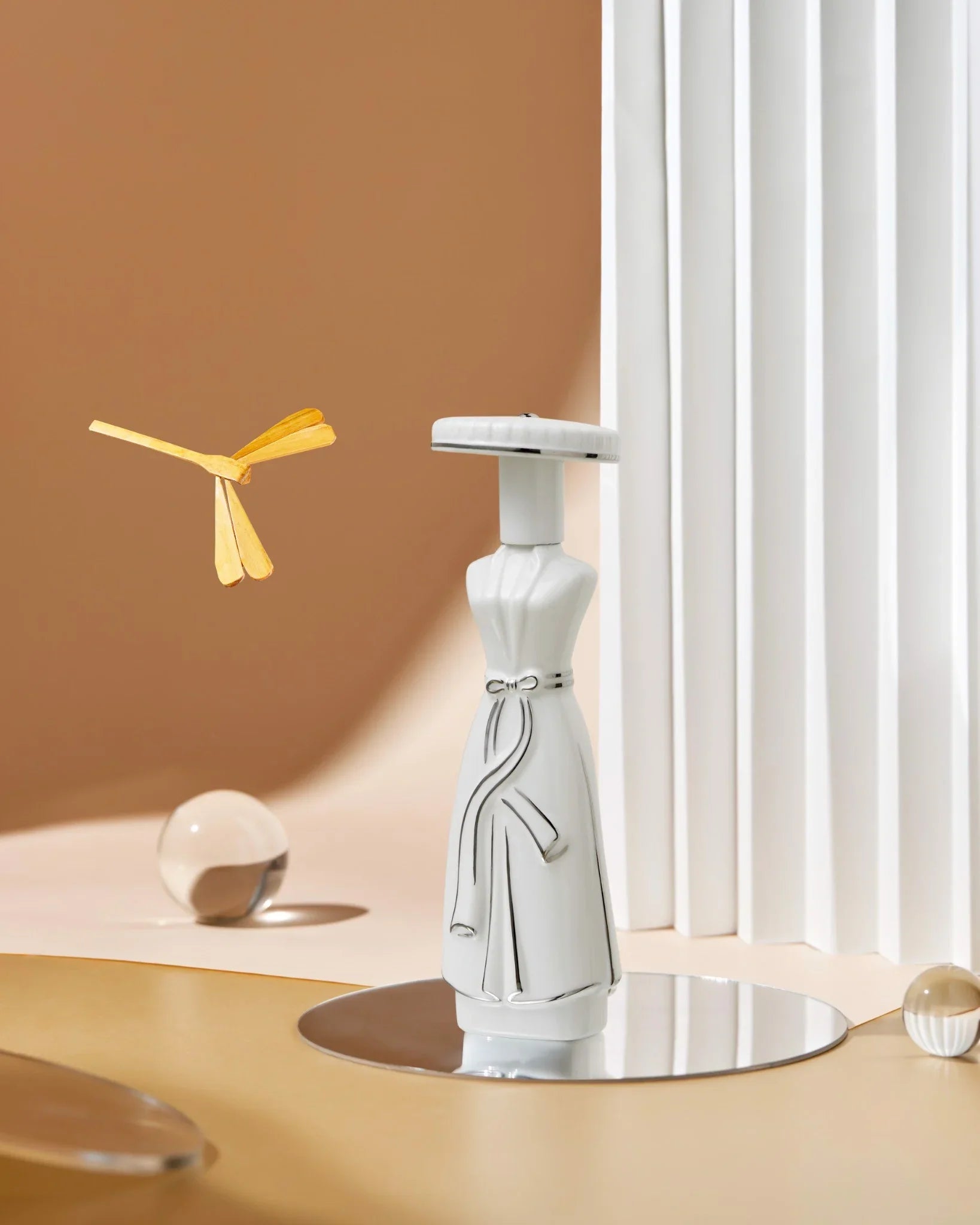 The perfume bottle is designed in the shape of a Hanoi girl in a traditional four-piece dress and sports hat, along with luxurious and eye-catching packaging. The bottle is made from high-quality Minh Long ceramics, glazed with 2 layers, and the textures are completely hand-painted by artisans. The point on the bottle is a white gold material full of class and value.