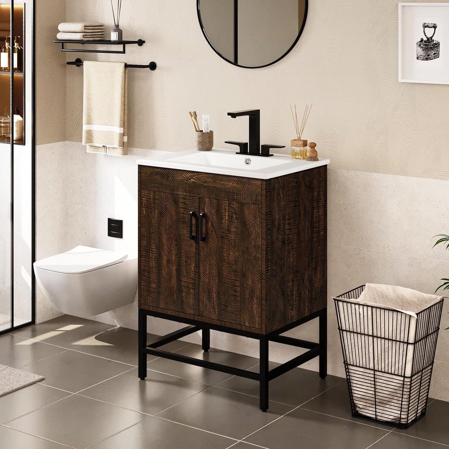 This Modern Dark Brown Wood Bathroom Vanity with White Ceramic Sink is made of a wooden frame, CARB P2-compliant MDF boards, a freestanding ceramic sink, and black spray-painted metal legs, such a combination is used to make the bathroom vanity more durable and sturdy. Crafted from solid ceramic, the pristine white sink has an anti-overflow hole and three tap holes for convenience. The 2-door cabinet interior under the ceramic basin provides ample space for installing pipes or storing some towels, soaps, hats, shampoos, and other items. This sink storage cabinet has a soft closing design for the cabinet door, ensuring quiet and smooth closure without any noise, even when closed quickly. The ceramic material is resistant to water and can endure exposure to water without deteriorating or distorting. The painted surface finish of the entire structure is easy to clean with a damp cloth, enabling effortless maintenance to keep it smooth and shining. Our bathroom vanity is specifically designed for compact spaces such as apartments and guest bathrooms. With dimensions of 61.5 cm L × 47 cm W × 86 cm H, this vanity effortlessly combines style and functionality, making it an ideal addition for spaces of any size. This bathroom vanity is equipped with a white ceramic basin, and a dark brown finish, making it versatile for any home decor and creating a vintage style. The elegant white ceramic basin features an anti-overflow hole, an integrated drain hole, and a three-hole faucet mount. With a spacious countertop and a two-door cabinet under the sink, this wooden bathroom cabinet offers ample storage, enabling efficient bathroom organization and maintaining a clutter-free space.