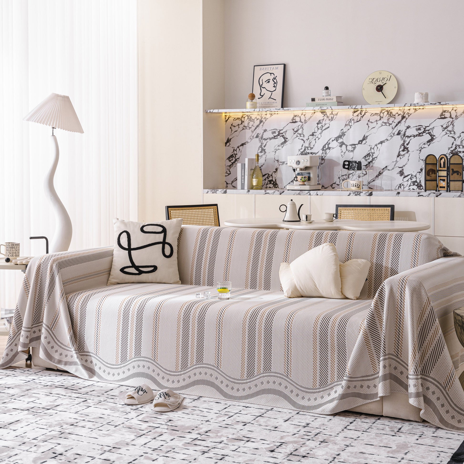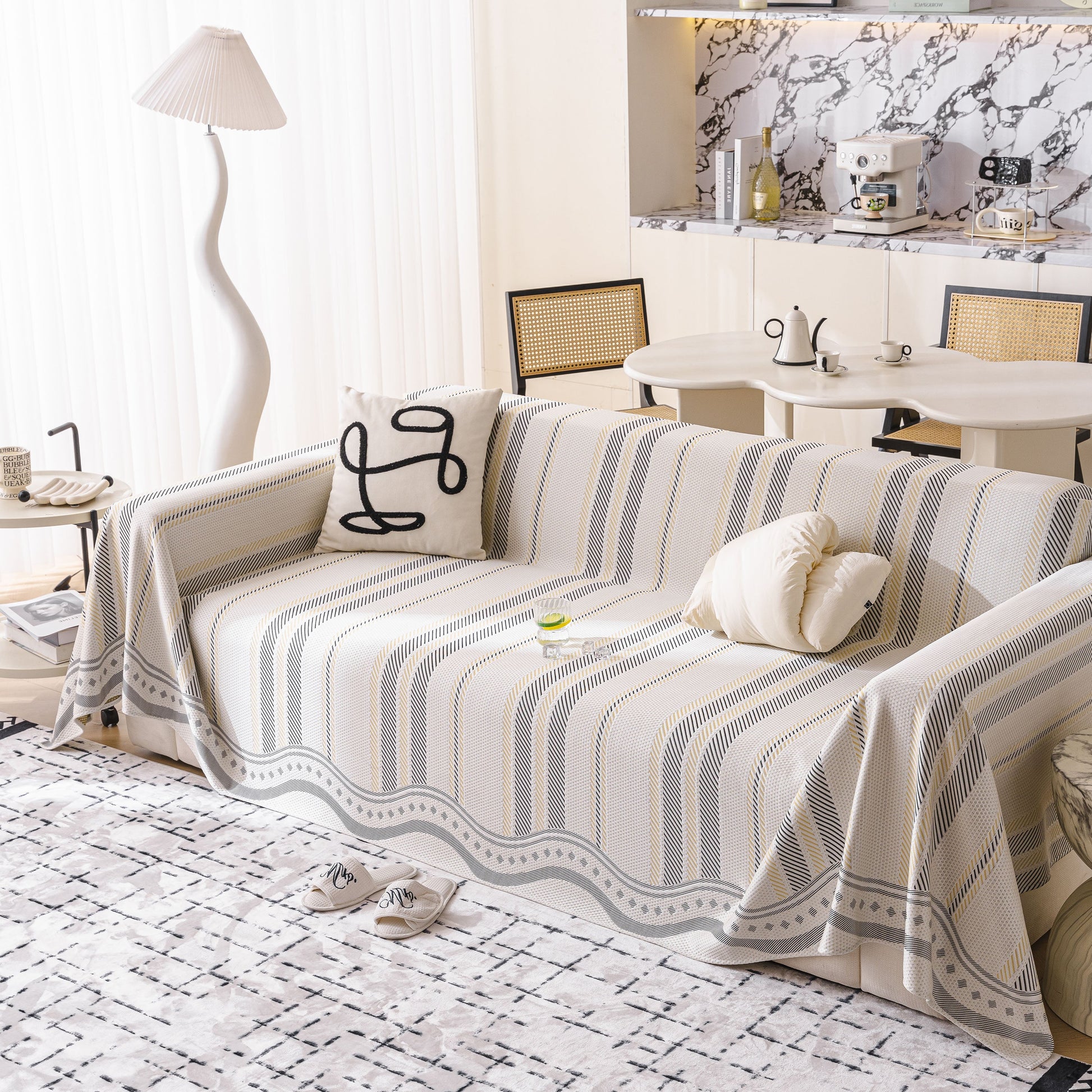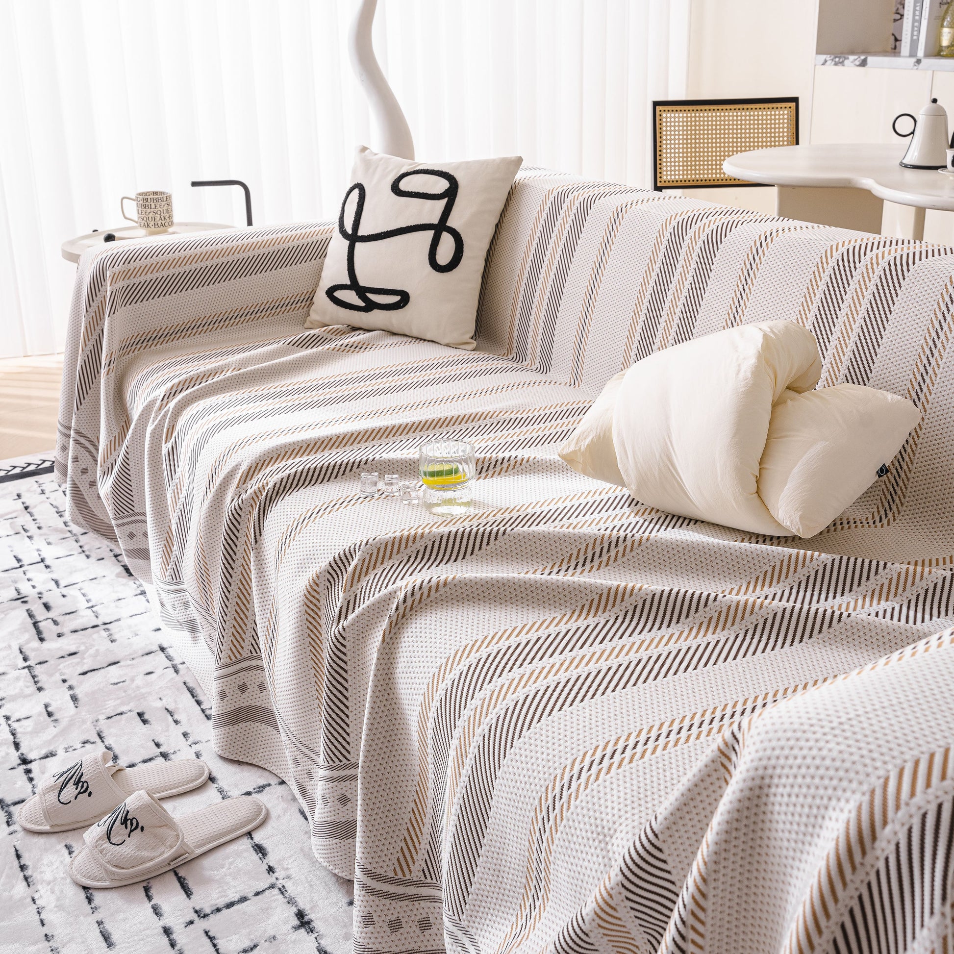 This sofa throw blanket features a geometric stripe pattern and a soft, smooth texture. The fabric is designed to be lightweight and breathable, providing a cool and comfortable surface. It can be used to cover and protect a couch or as a decorative accent piece in your living room.