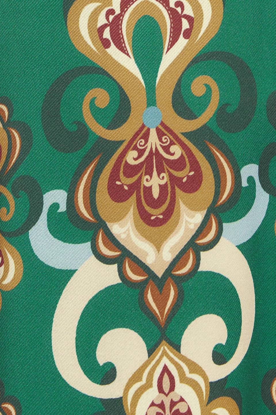 A printed woven midi dress featuring round neckline, long sleeve with cuff, circle skirt, back cut out with tie and zipper closure