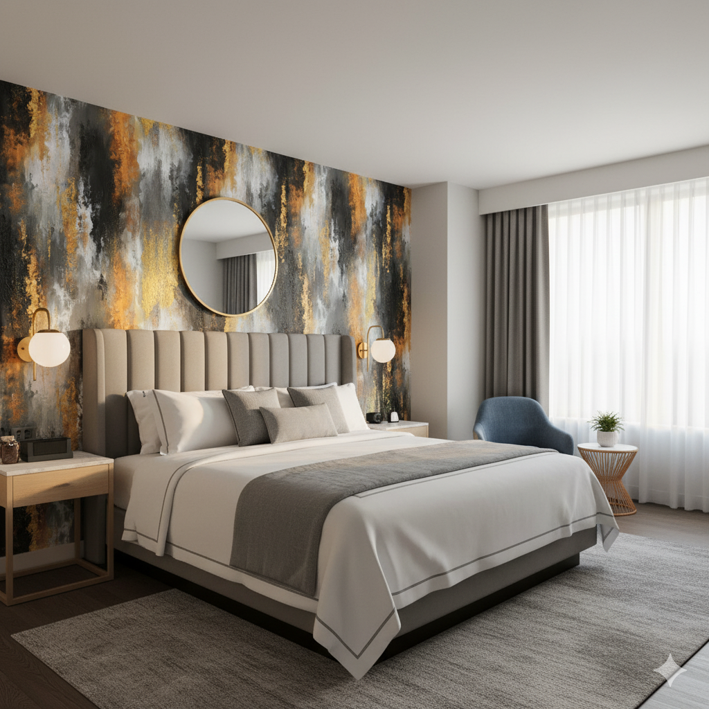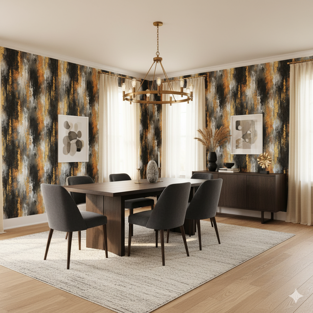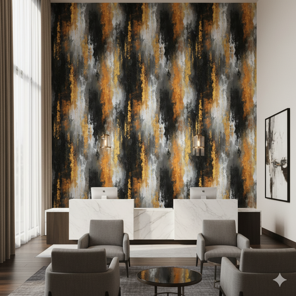Vertical streams of fire, ash, and smoke seem to pour down the surface, blending searing oranges and golds with deep blacks and greys. The texture feels raw, layered, and tactile, recalling both industrial patina and the natural drama of lava falls or scorched rock faces. This design suits bold, modern interiors where walls should command immediate attention, from feature dining areas to stylish office spaces. It thrives in dramatic light, where the reflective gold contrasts the matte textures, enhancing the illusion of cascading energy. Both fiery and grounded, it captures the intensity of elemental transformation.