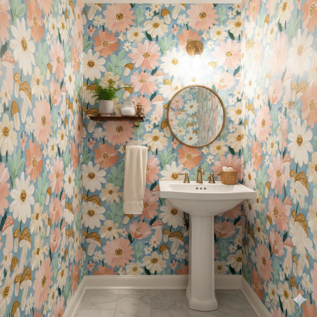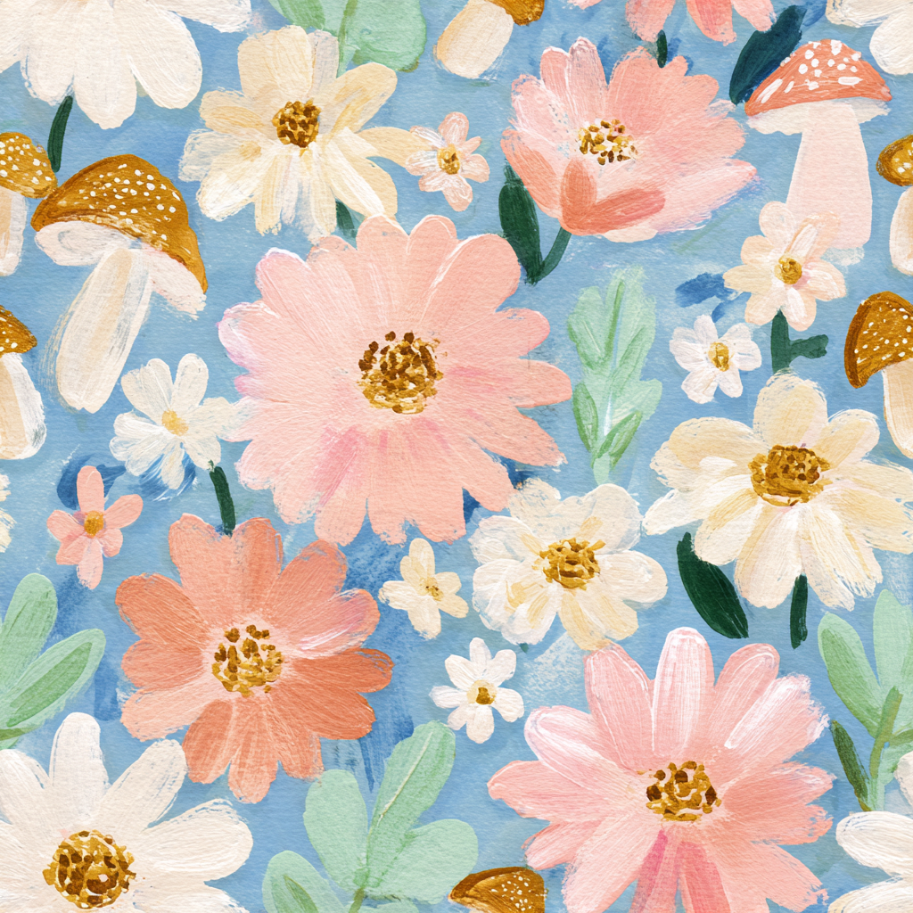 Oversized daisies and garden flowers painted in creamy whites, blush pinks, and buttery yellows unfold against a sky-blue background, interspersed with whimsical mushrooms in caramel and ochre. The painterly style feels illustrative, giving the wallpaper a fantastical, cottagecore atmosphere that’s both playful and nostalgic. It’s the kind of design that transforms a room into a fairytale meadow, perfect for nurseries, reading nooks, or kitchens where a touch of wonder is desired. The earthy mushroom accents keep the palette balanced and grounded, preventing the florals from feeling overly sweet.