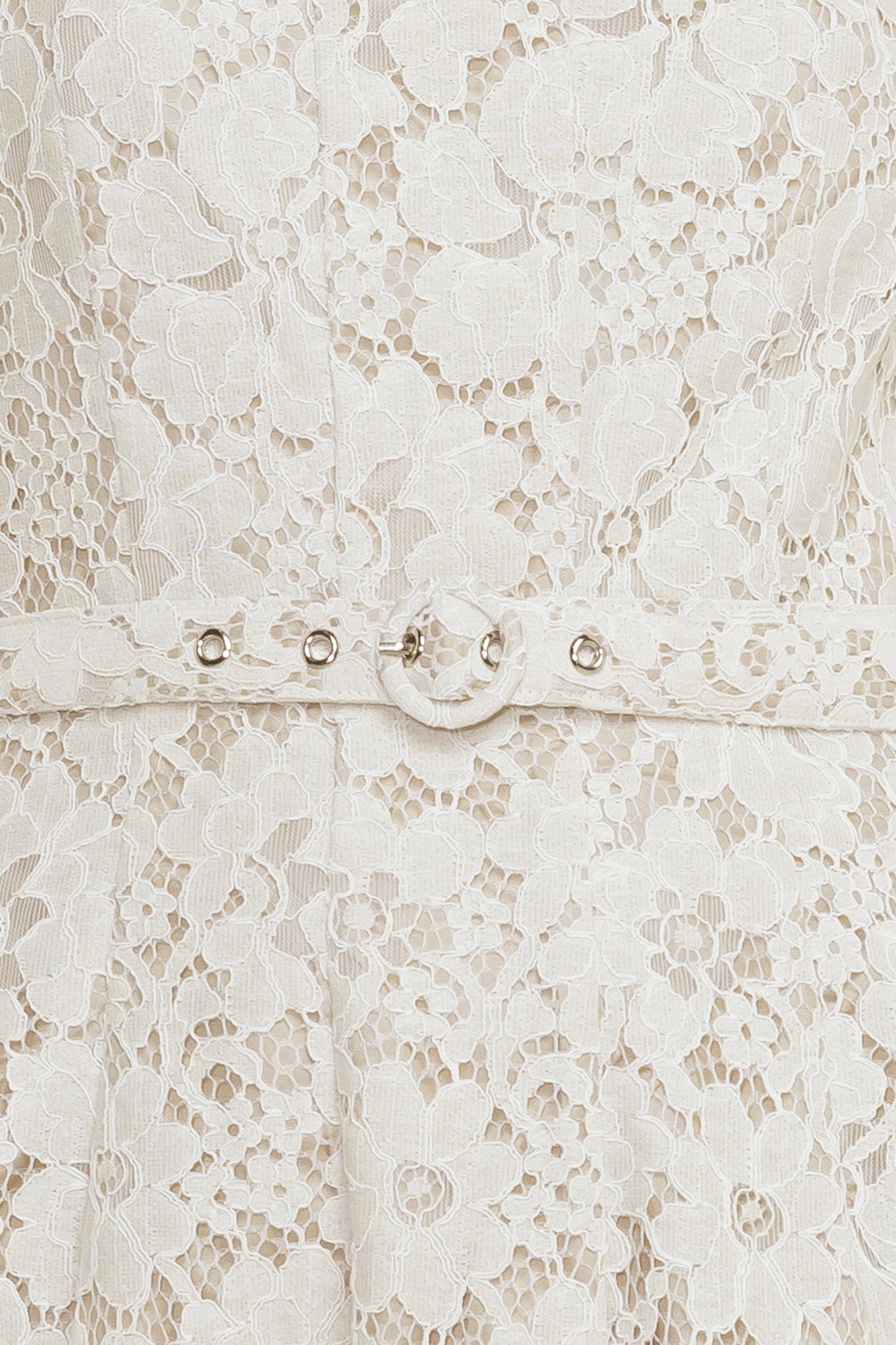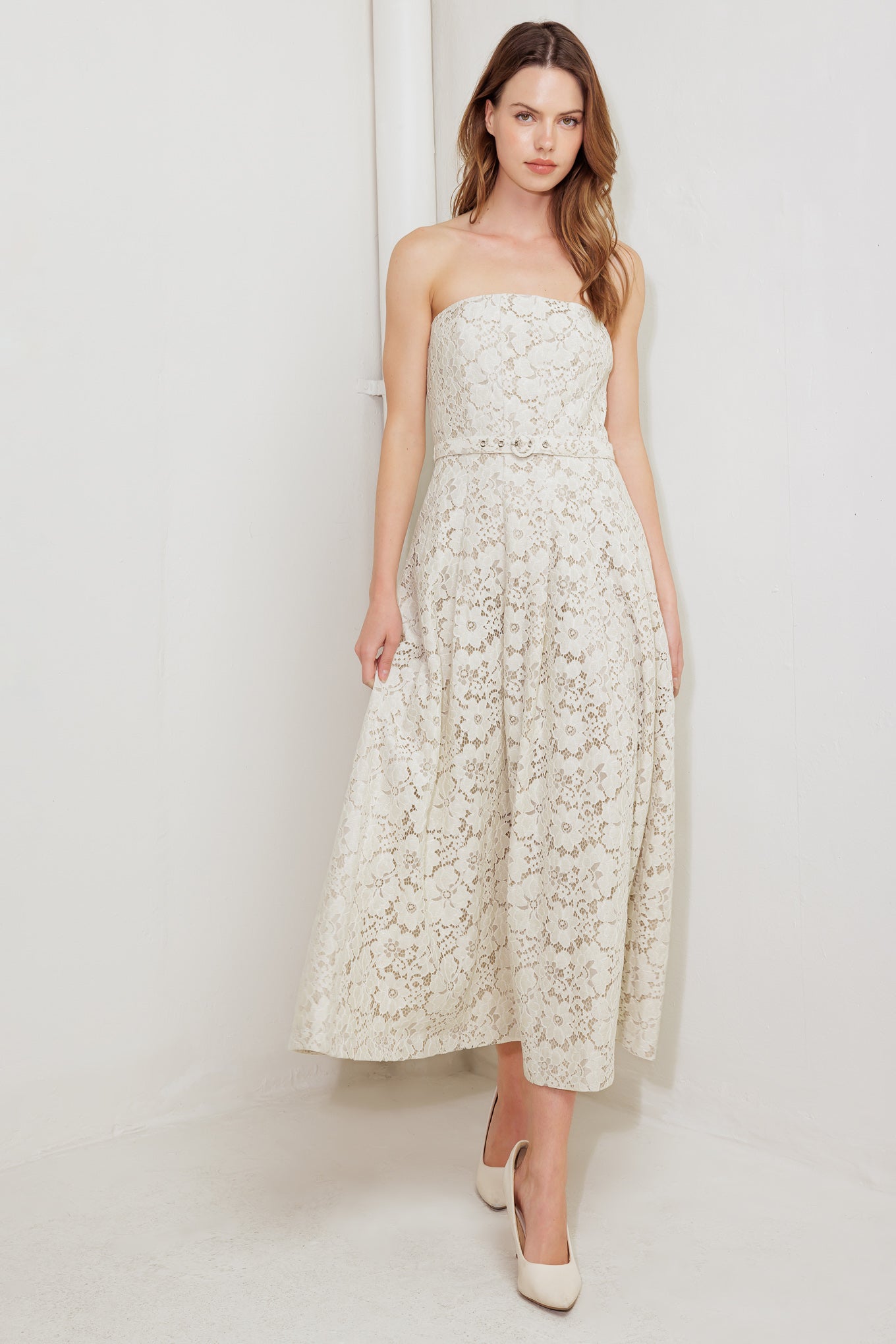 A strapless, woven lace midi dress featuring straight neckline, self belt, full skirt and back zipper closure