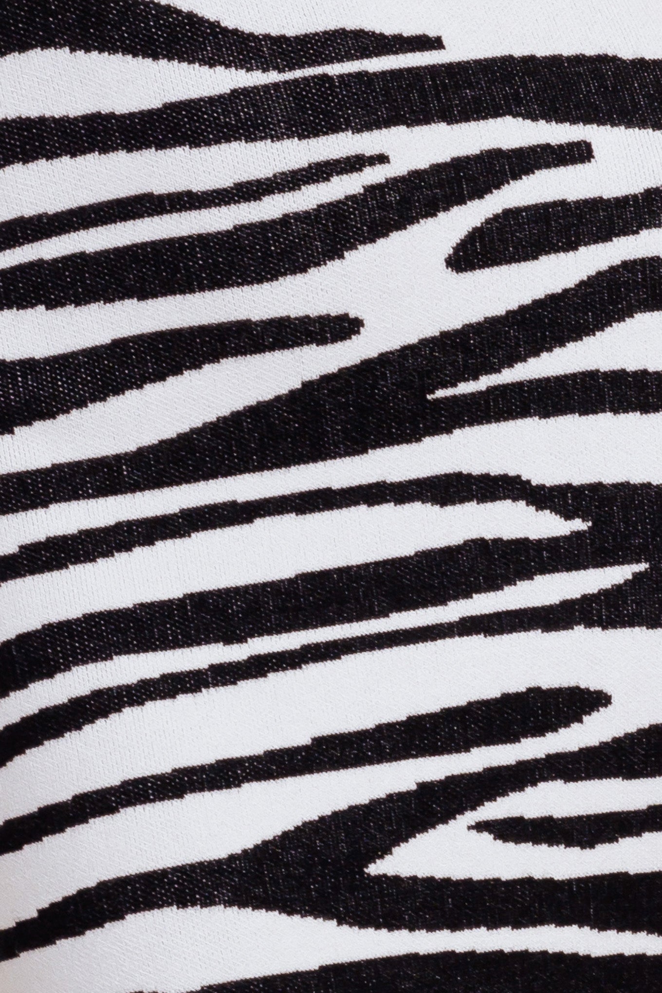 A strapless, zebra print, sweater knit midi tube dress with back slit