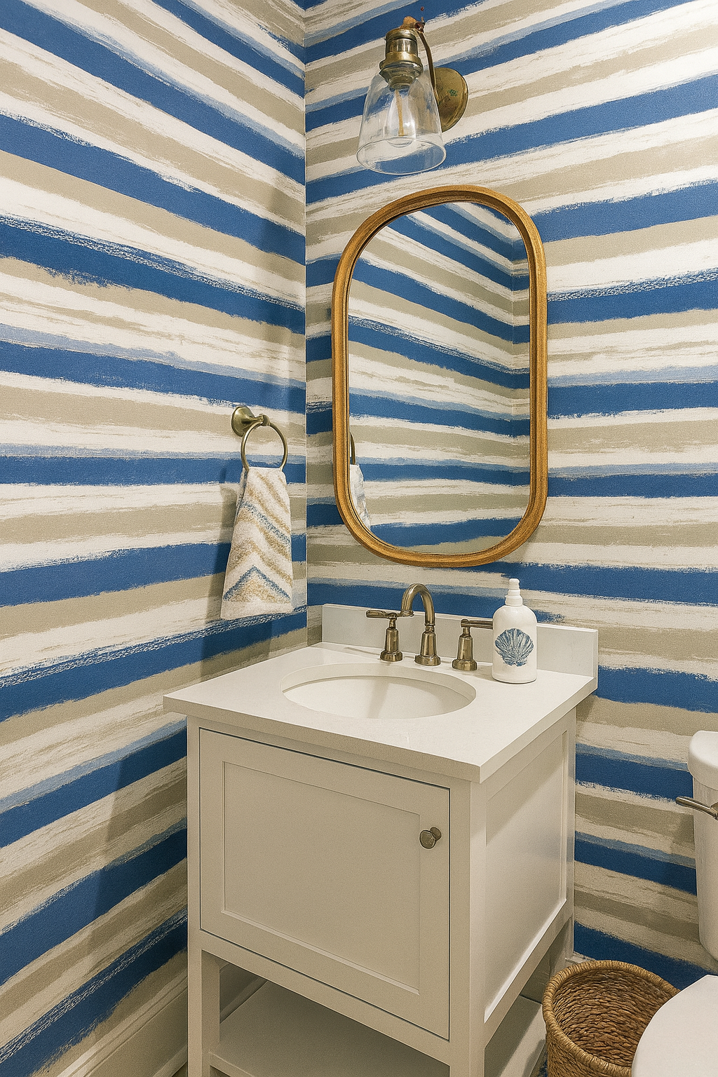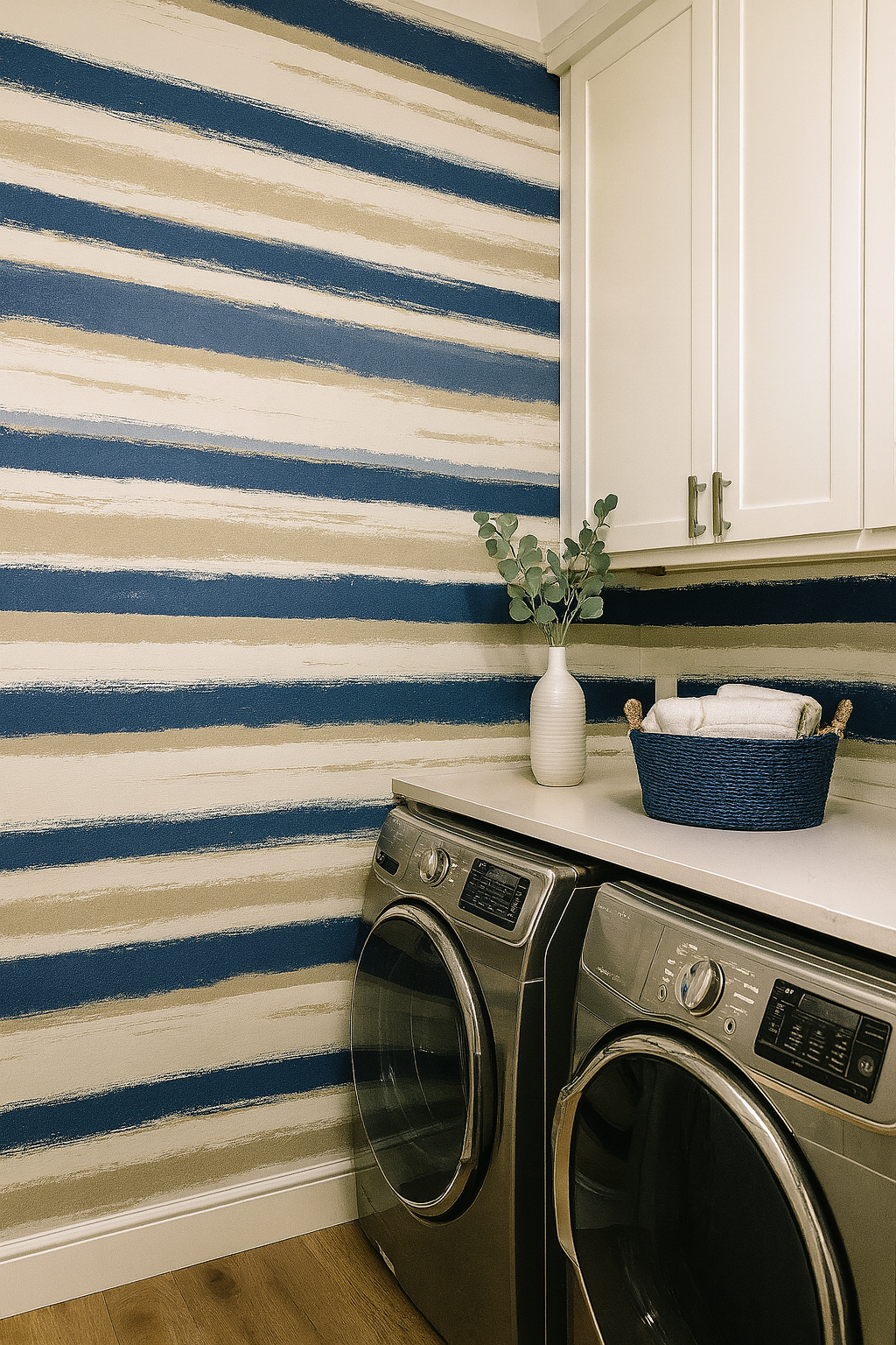 Weathered, broad brushstroke stripes in navy, sand, and white evoke a rugged, sun-washed canvas sail flapping in the sea breeze. The hand-rendered edges bring texture and movement, while the palette stays classic maritime. Think beach umbrellas, cabana cushions, or mudroom walls with casual, lived-in polish. A grounded, timeless essential for any coastal aesthetic.