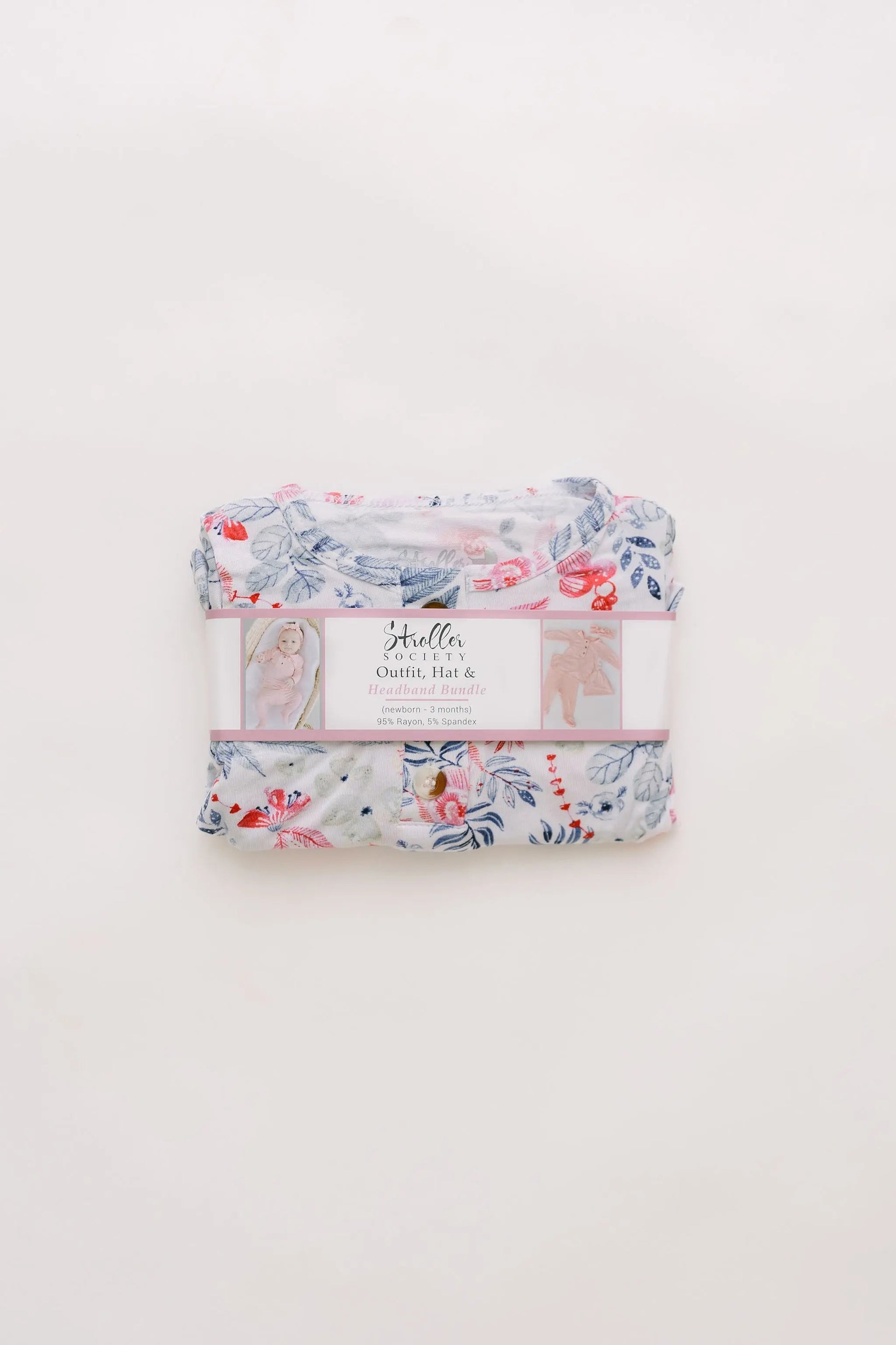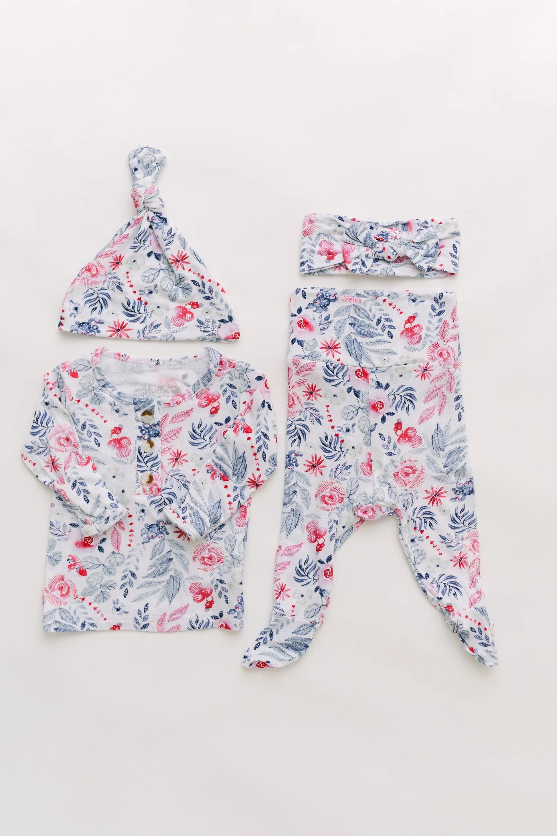 You're going to love this baby outfit! Made from the same soft and stretchy material as our swaddles and gowns this top and bottom outfit hat and headband set will be your new favorite baby attire. This bloom floral print is perfect for baby girls. This is the perfect "coming home outfit" with room to grow!