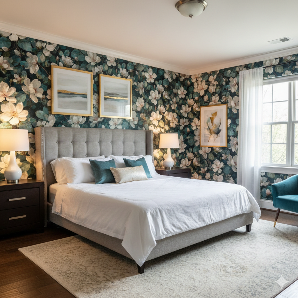 Cream magnolia blossoms open across a rich indigo background, their petals glowing softly as though lit by moonlight. Deep teal and green foliage adds layered drama, making this wallpaper feel both romantic and commanding. Perfect for bedrooms, powder rooms, or elegant dining spaces, it creates a sense of intimacy and sophistication. Its contrast of dark ground and luminous florals makes it versatile: pair it with gold accents for glamour, or natural woods for a grounded organic feel. It captures the timeless beauty of magnolia blooms while elevating them into high art.