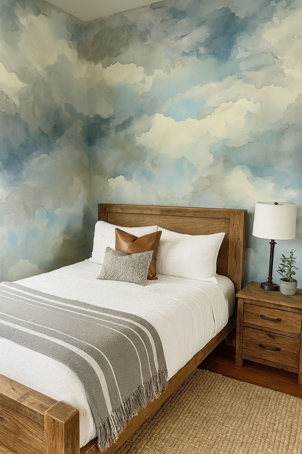 Dive into the dreamy expanse of sky-inspired watercolor with Nimbus Fade, a fluid wash of cloud-like formations in tranquil hues of sky blue, slate, misty gray, and cream. The abstract blending creates a gentle, ever-shifting mural effect ideal for bedrooms, nurseries, or relaxation spaces. This cloudscape wallpaper is a soft, meditative visual escape for any serene interior.