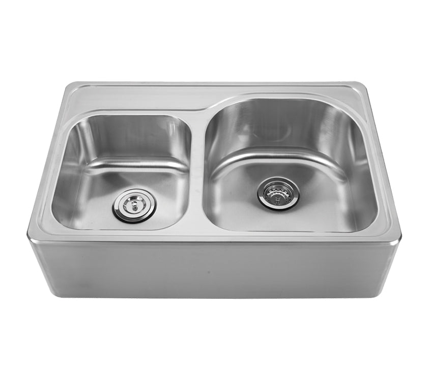 Noah's Collection Stainless Steel Sinks are unsurpassed in quality and design. Whitehaus Collection has constructed these sinks from 16, 18, and 20 gauge, 304 stainless steel with an 18/8 chrome and nickel content. The benefit of this quality stainless steel ensures them to be scratch, stain and chip resistant. Equipped with full undercoat over noise reduction dampening pads, ensures a quieter and easier clean up, making it one of the most durable sinks on the market. Noah’s Collection adds beauty to its durability by using a fine brushing technique that enhances the sheen and luster of the final product. Available in single or double bowl models for under mount, drop-in or front apron application, your choice of any of our sinks will leaving a lasting impression in your kitchen. The Noah's Collection Brushed Stainless Steel double bowl drop-in sink with a seamless customized front apron has the larger bowl on the right side only.