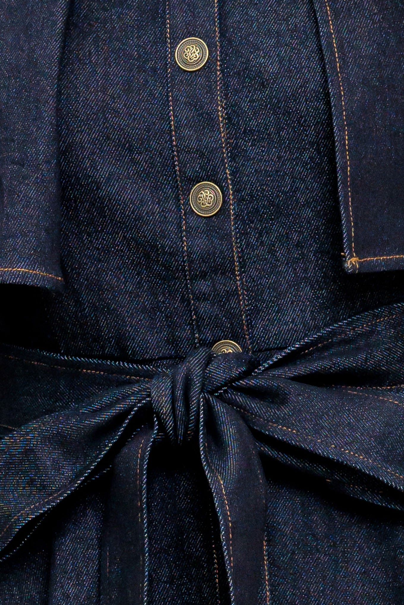 A denim midi dress featuring collar, front button down, cape top, self sash tie, and circle skirt