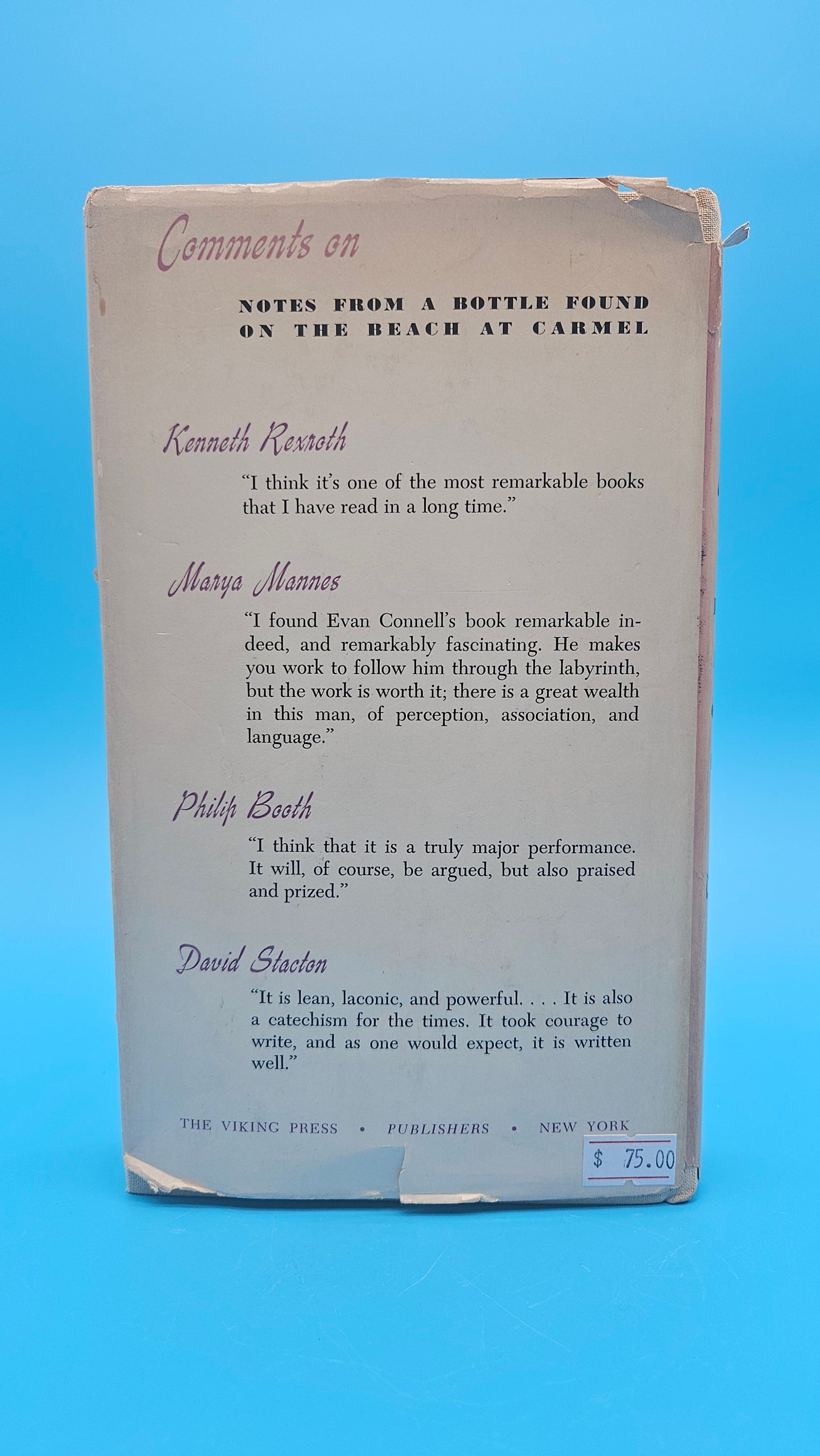 Add a piece of mid-century literary charm to your collection with this 1963 first edition of Notes from a Bottle Found on the Beach at Carmel by Evan S. Connell Jr. Published by The Viking Press and printed in the USA.