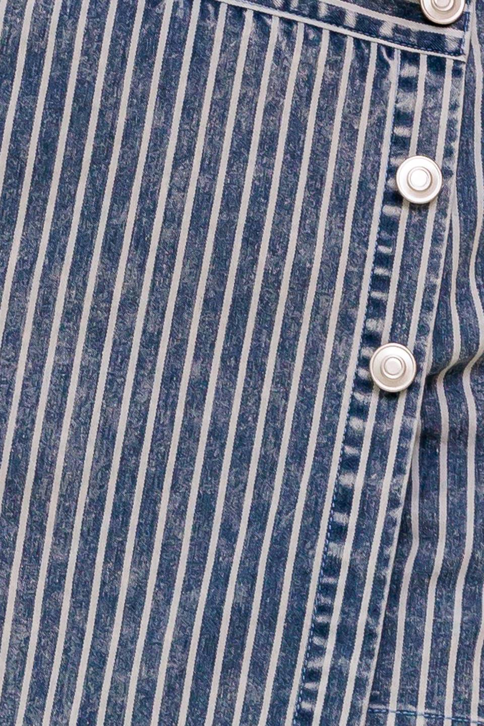 A striped denim featuring front button detail, back pocket and zipper closure