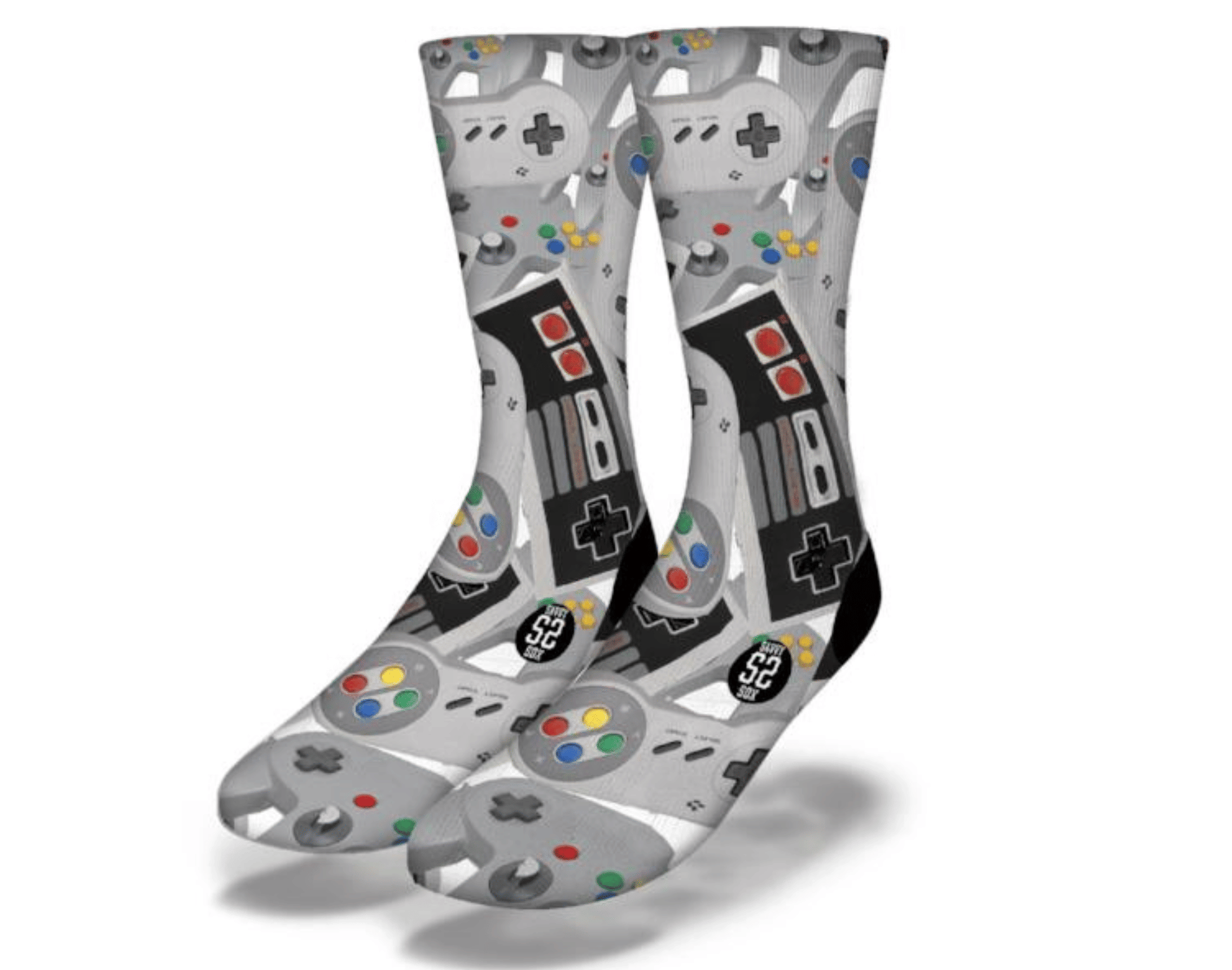 YOU'RE AN OG IN THESE, PLAYER ONE! OLD SCHOOL RULES IN THESE VIDEO GAMING THEMED SOCKS PERFECT FOR FLEXING TO YOUR CLAN! NOT FOR THE NOOBS, YOUR THUMBS WILL GET BUSY WITH THESE CONSOLES, CONTROLLERS & JOYSTICKS! GG!