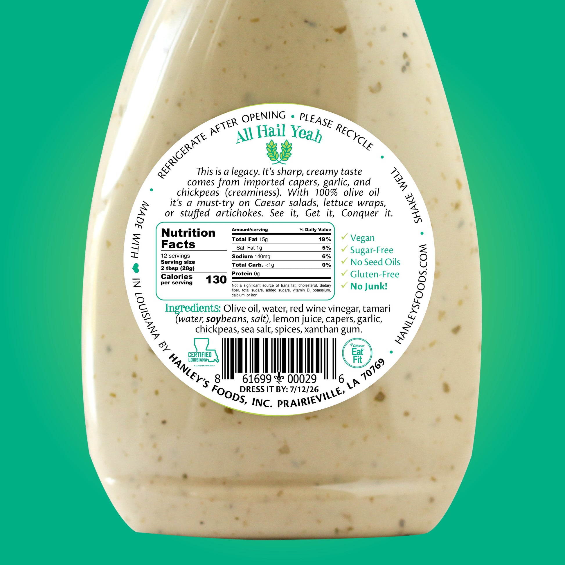 You’re holding a legacy. It’s sharp, creamy taste comes from imported capers, garlic, and chickpeas (creaminess) without seed oils. A must-try on Caesar salads, lettuce wraps, or stuffed artichokes. See it, Get it, Conquer it.