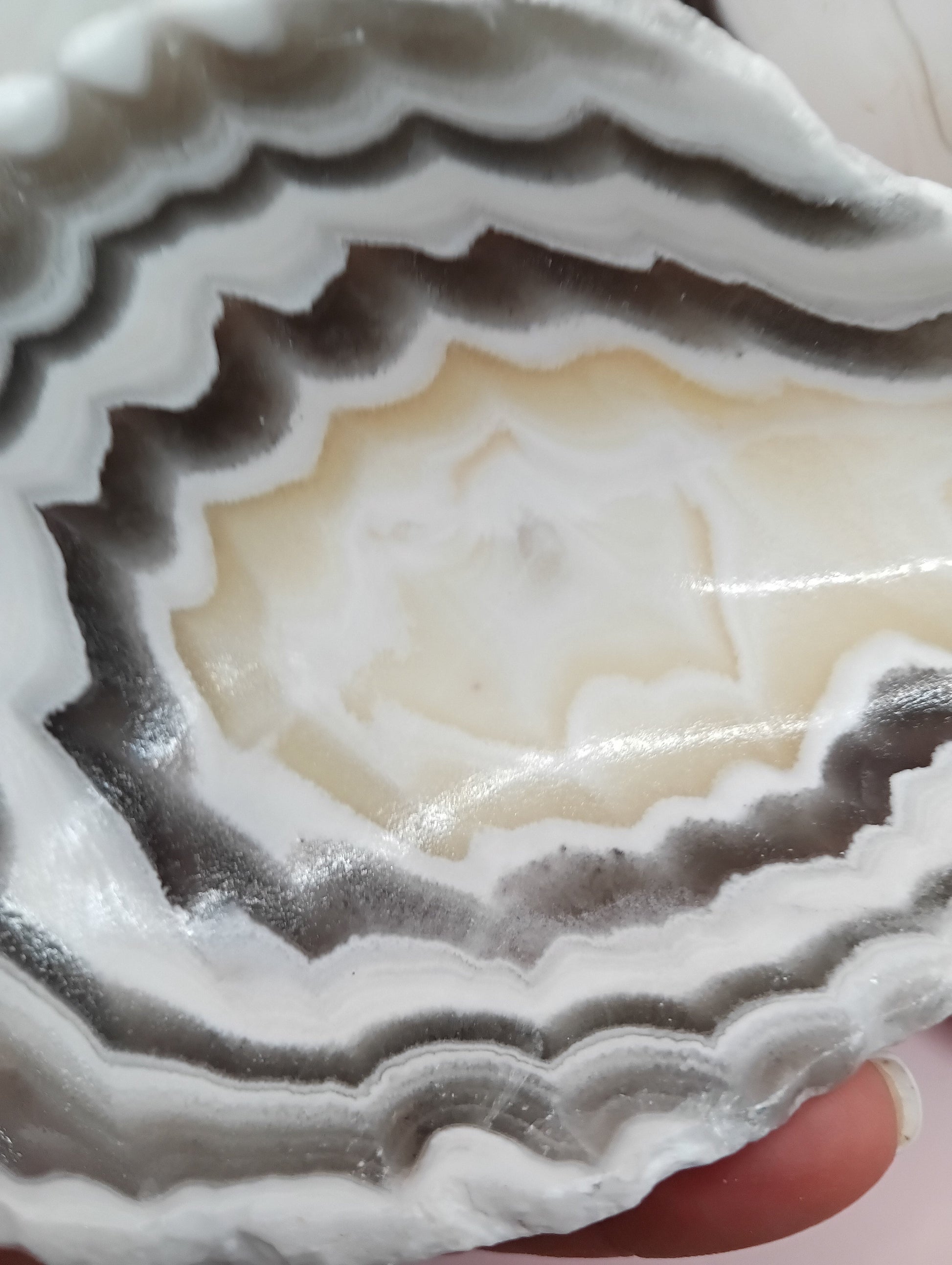 Each of these exquisite shell-shaped bowls is carefully carved from natural onyx, showcasing stunning layers of creamy whites, soft grays, and earthy browns. These polished slices are not only beautiful to behold but also highly functional. Use them to display jewelry, crystals, smudge sticks, or simply as a decorative accent piece for your coastal or earthy home décor.