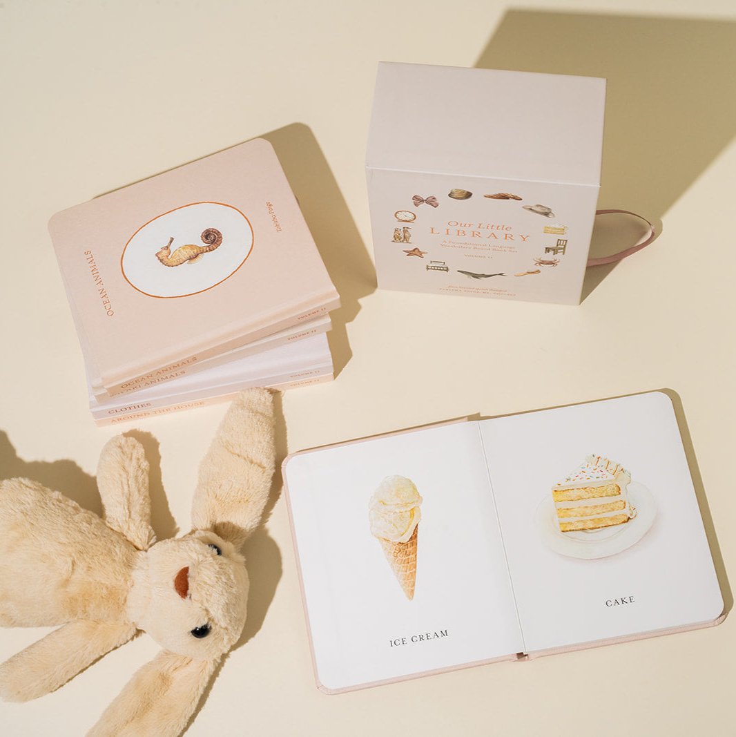 Designed by a professional watercolor artist and licensed speech therapist, Our Little Library Vol. 2 includes five new board books that feature charming watercolor illustrations and foundational first words that will help you build your child's vocabulary. The durable materials and small book size also make them perfect for your baby's little hands.