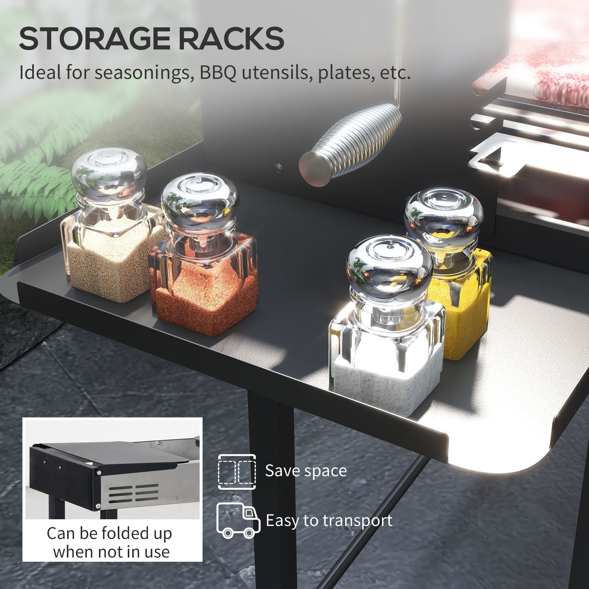 - Foldable Shelves: With two side tables, this BBQ grill offers enough room for seasonings and ingredients on the right and finished dishes on the left, freeing up your hands so you can focus on grilling.