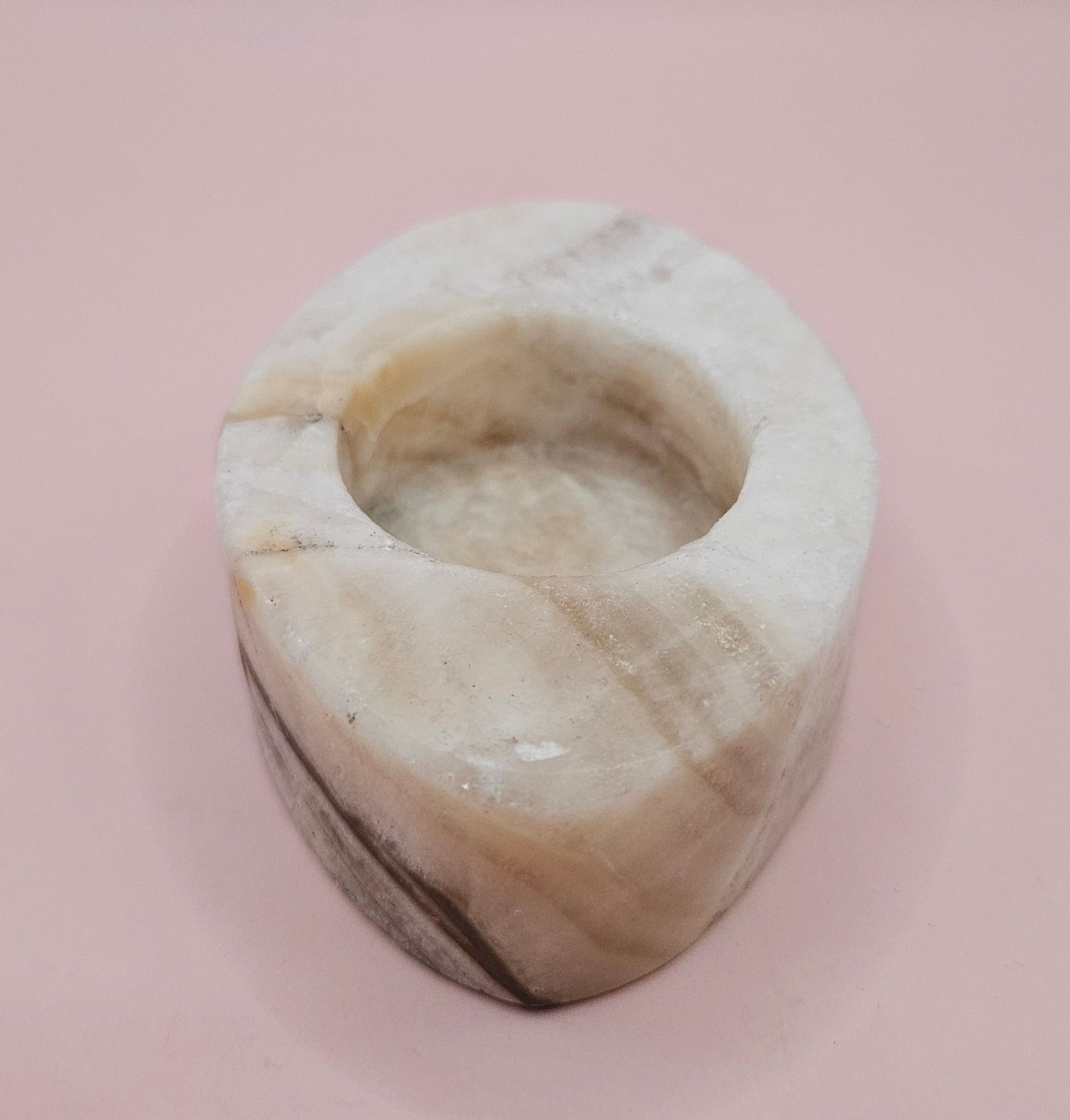 Bring nature's artistry into your space with this hand-carved oval onyx candle holder. Featuring soft white tones layered with smoky brown veining, the smooth, rounded silhouette adds organic calm and subtle sophistication to your decor.