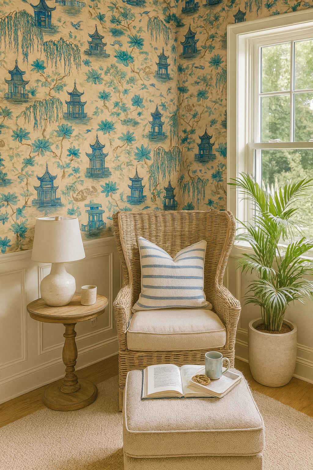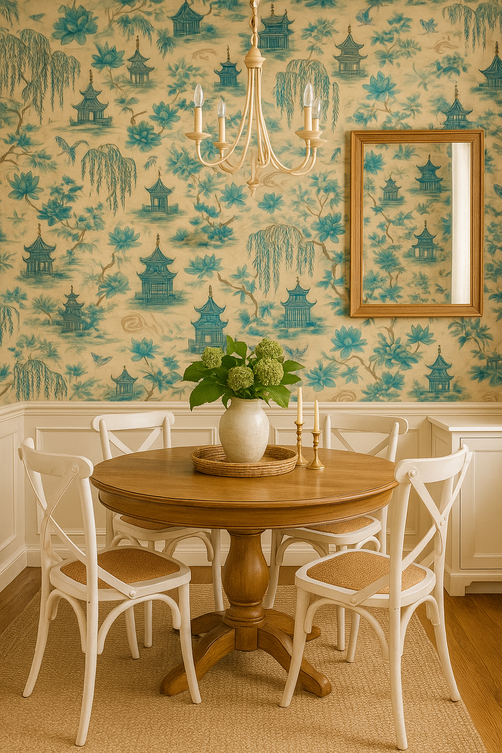 Step into an illustrated world of serene ponds, lotus blossoms, and delicate pagodas. Pagoda Daydream features intricate inking in cool cerulean blues and soft aquas against a tan parchment-like base, delivering a vintage chinoiserie feel. Works beautifully in eclectic entryways, heritage-inspired dining rooms, or as a sophisticated mural backdrop.