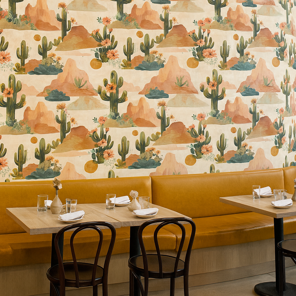Southwestern mesas, saguaro cacti, blooming desert florals, and golden suns create a painterly landscape full of movement and color. The style is whimsical but detailed, with a modern folk-art energy and warm desert tones—think terra cotta, clay pink, sage, and dusty teal. It’s stylized without being juvenile and works beautifully across home décor or nursery collections.