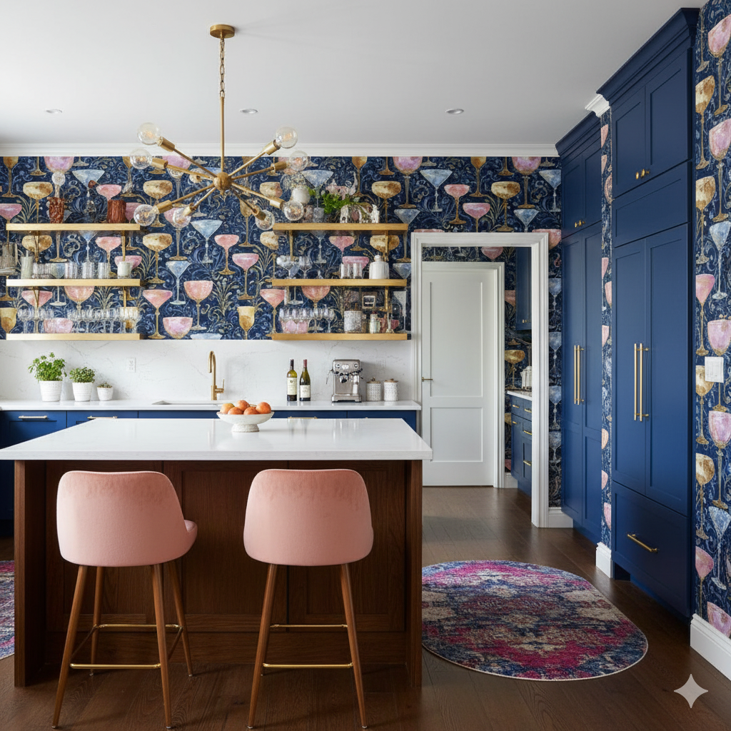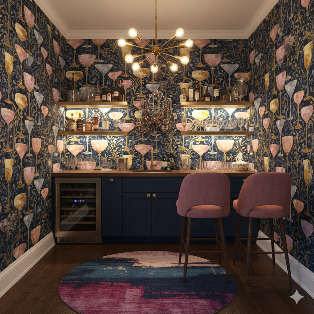 A whimsical yet refined display of martini and coupe glasses floats across a navy backdrop adorned with swirling flourishes of gold. Rendered in soft watercolor shades of blush, lilac, and champagne, the glasses overlap like a playful toast frozen in time. There’s an old-world glamour here, reminiscent of Parisian salons, cocktail lounges, and art deco soirées. The pattern is festive without being brash, making it a sophisticated choice for bars, dining rooms, or party-focused interiors. Paired with mirrored accents, velvet stools, or marble counters, it transforms a space into a setting worthy of endless celebrations. The mix of watercolor translucence and gilded embellishments brings an effortless sense of joy and elegance to any room.