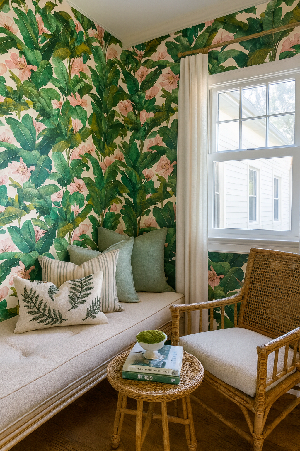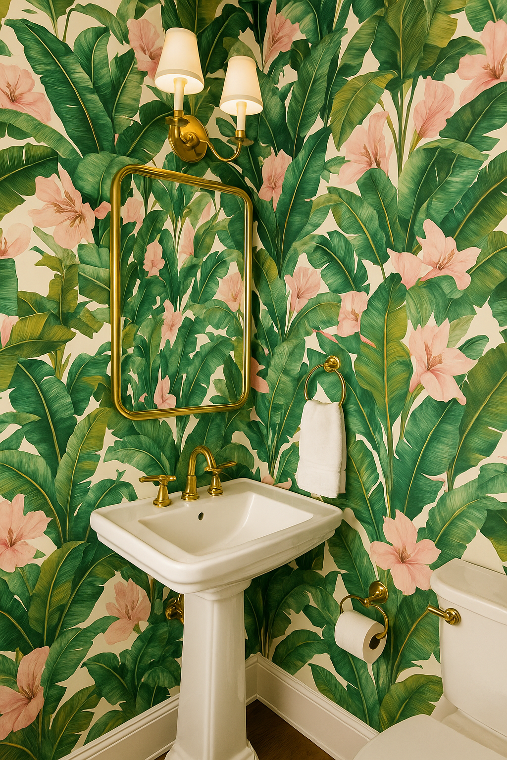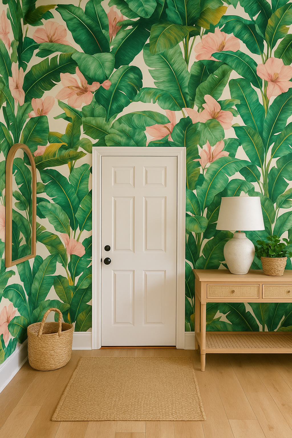 Lush, painterly, and bold—Palm Mirage immerses you in a tropical dreamscape. Oversized green banana and travelers palm leaves interweave with blush-pink florals over a creamy backdrop. This vibrant wallpaper brings the energy of a jungle retreat to any space, ideal for statement walls in sunrooms, vacation rentals, bathrooms, or boho-glam bedrooms.