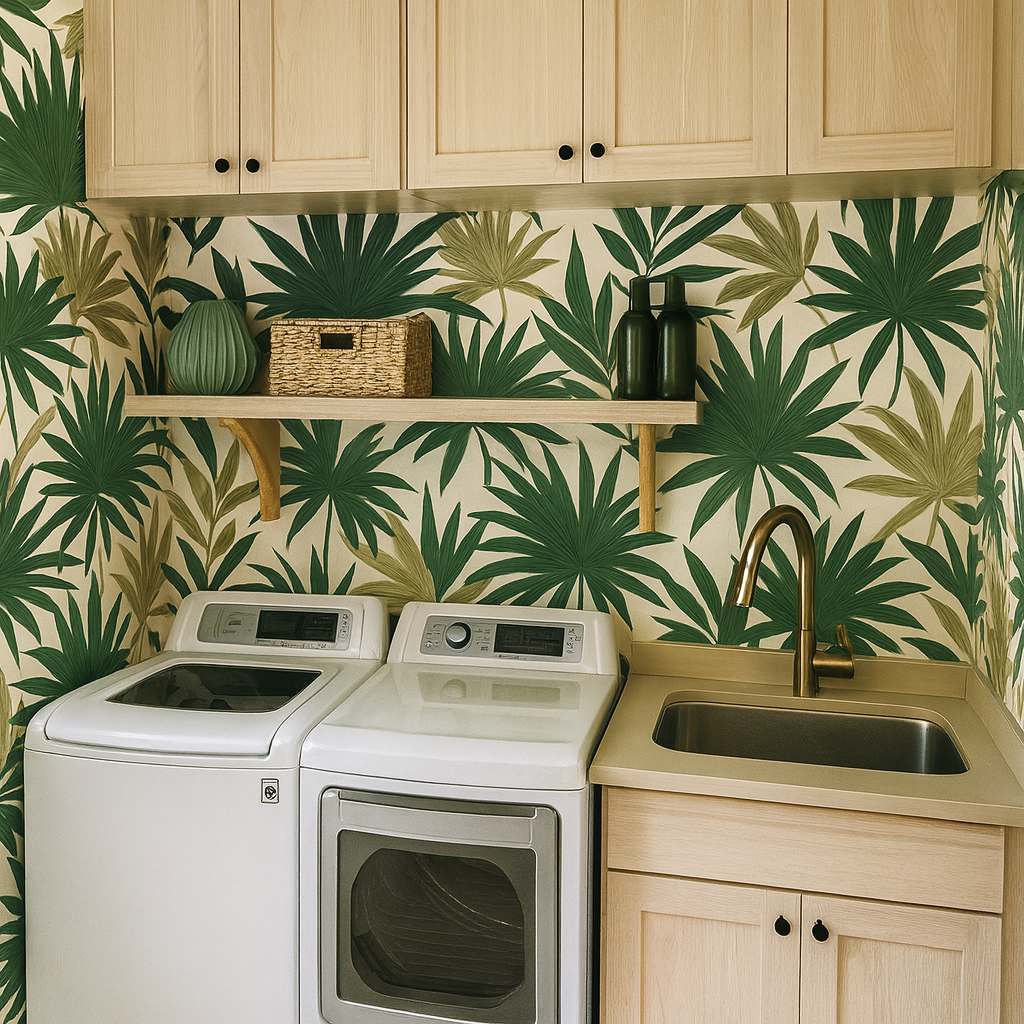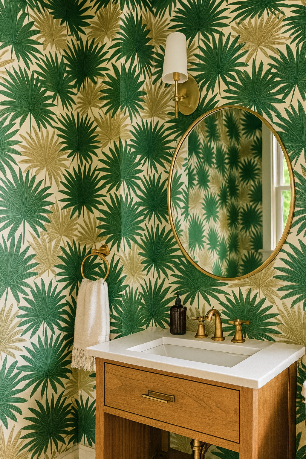 Tropical minimalism meets rhythmic geometry in Palm Parade. This striking wallpaper features stylized palmetto fan leaves in shades of deep jungle green and sandy beige on a clean cream backdrop. Ideal for modern coastal homes, contemporary lobbies, or beach-themed powder rooms, it brings an architectural foliage vibe to your walls.
