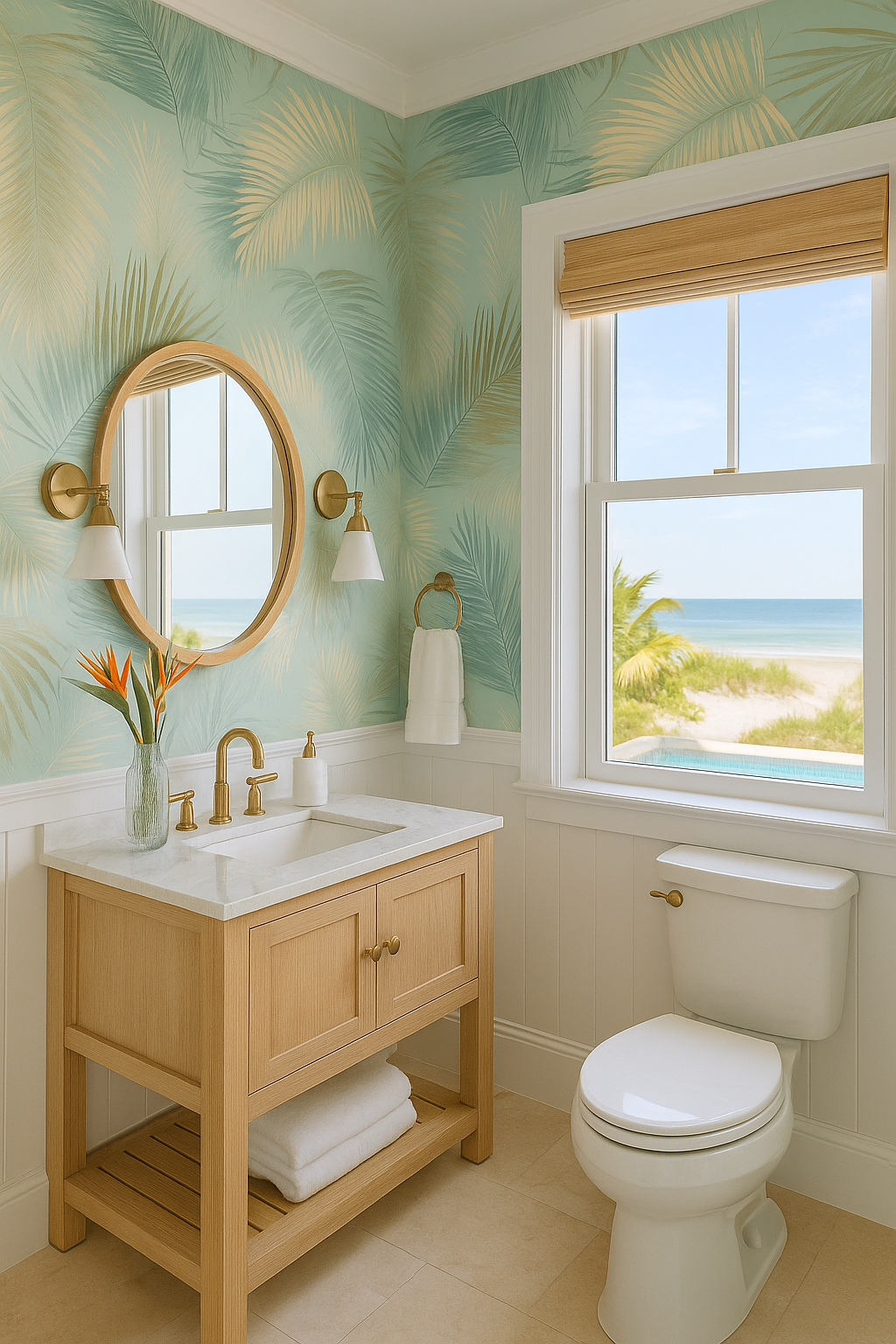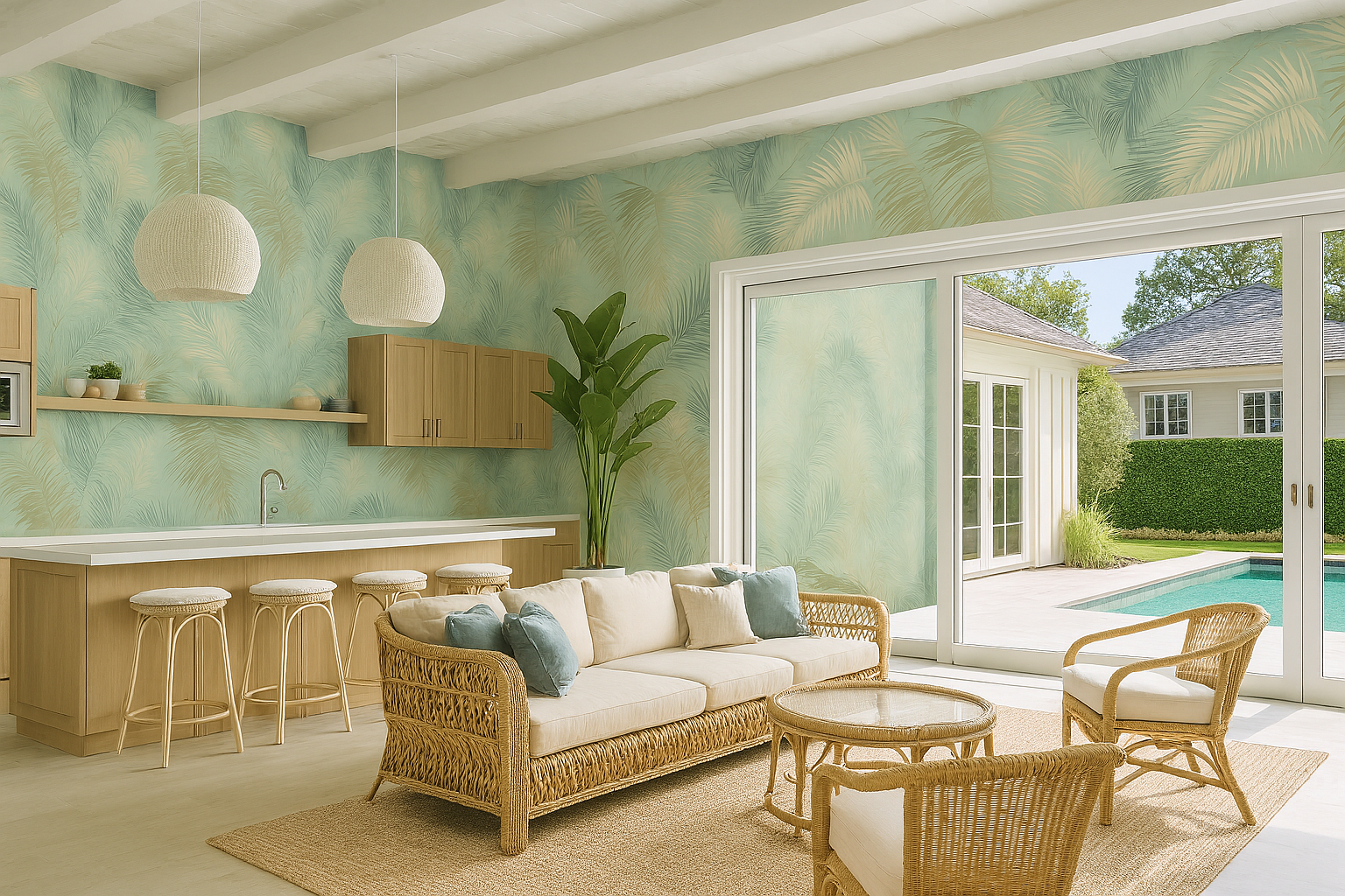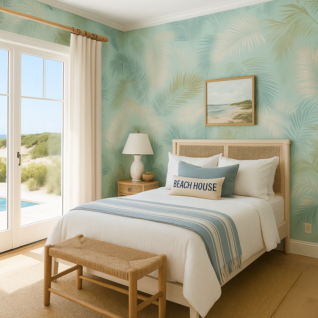 Soft and barely-there, Palmshade layers delicate fronds over a powdery aqua backdrop, as if sunlight is filtering through a canopy of palm leaves. This subtle tropical wallpaper leans breezy and modern, with enough movement to feel alive but enough restraint to remain versatile. Ideal for coastal interiors, minimalist bathrooms, or laid-back nurseries that need a whisper of nature, not a shout.