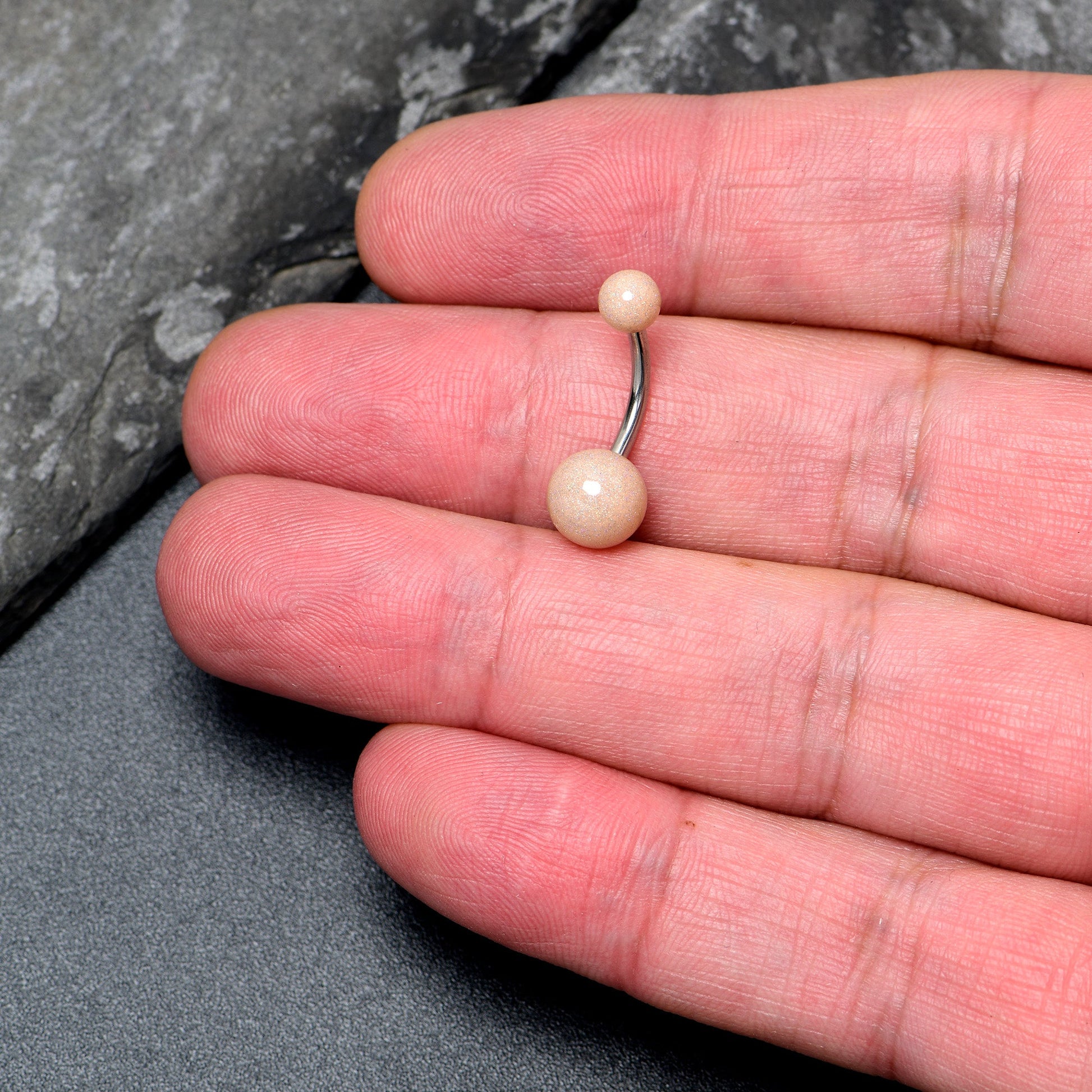 Add some shimmer to your style when you are rocking this 14 gauge navel ring. It is made with a 3/8 inch 316L surgical grade stainless steel curved barbell with a 5mm top ball end and an 8mm bottom ball end. It features pastel peach acrylic ball ends with a shimmer effect that is sure to get noticed. Let a new day dawn for your look when you're rocking this shimmery peach belly piercing ring. Acrylic Glitter Belly Button Ring.
