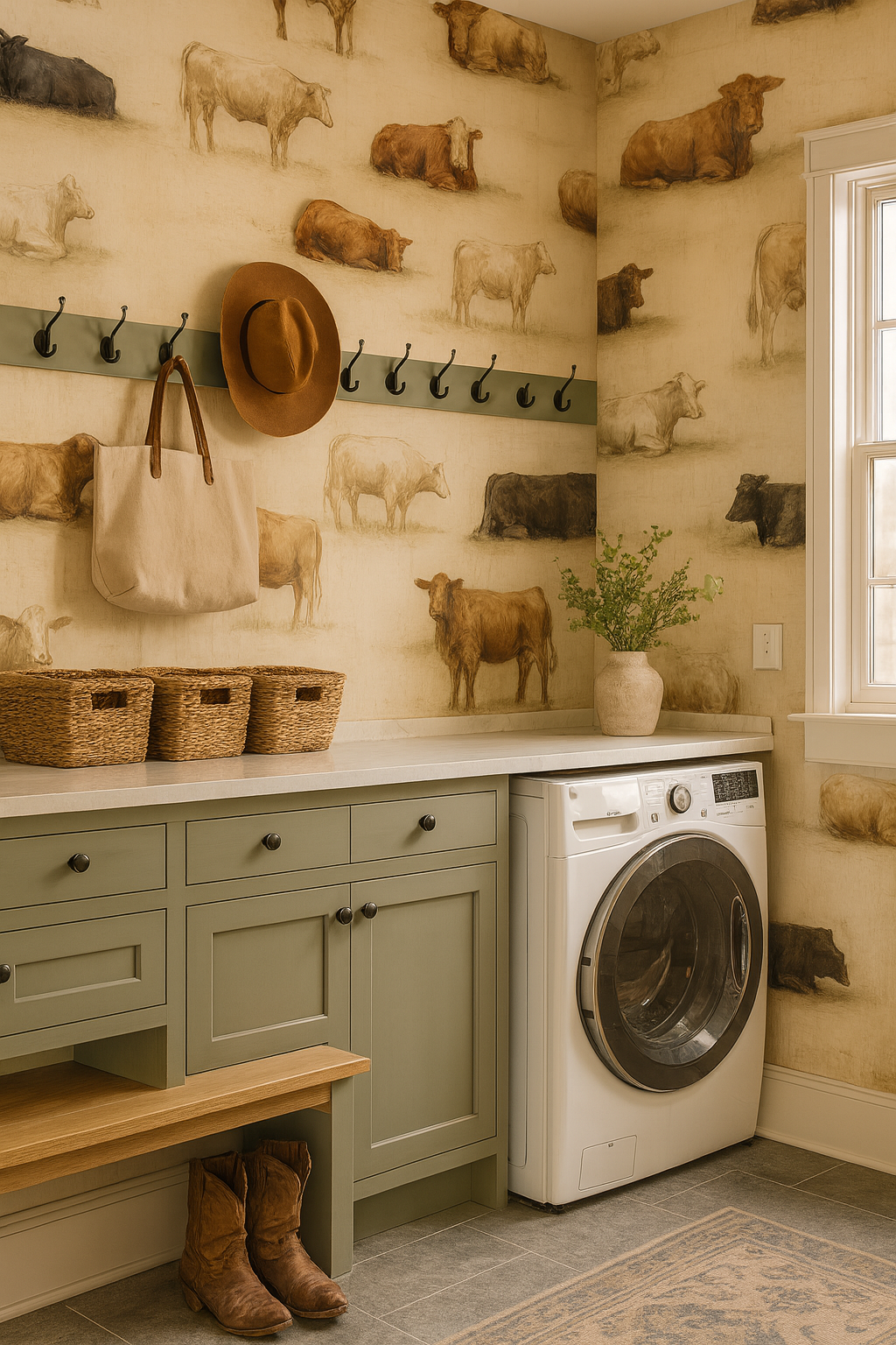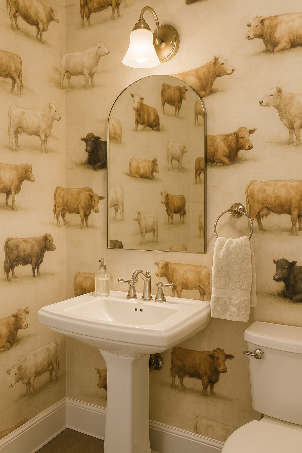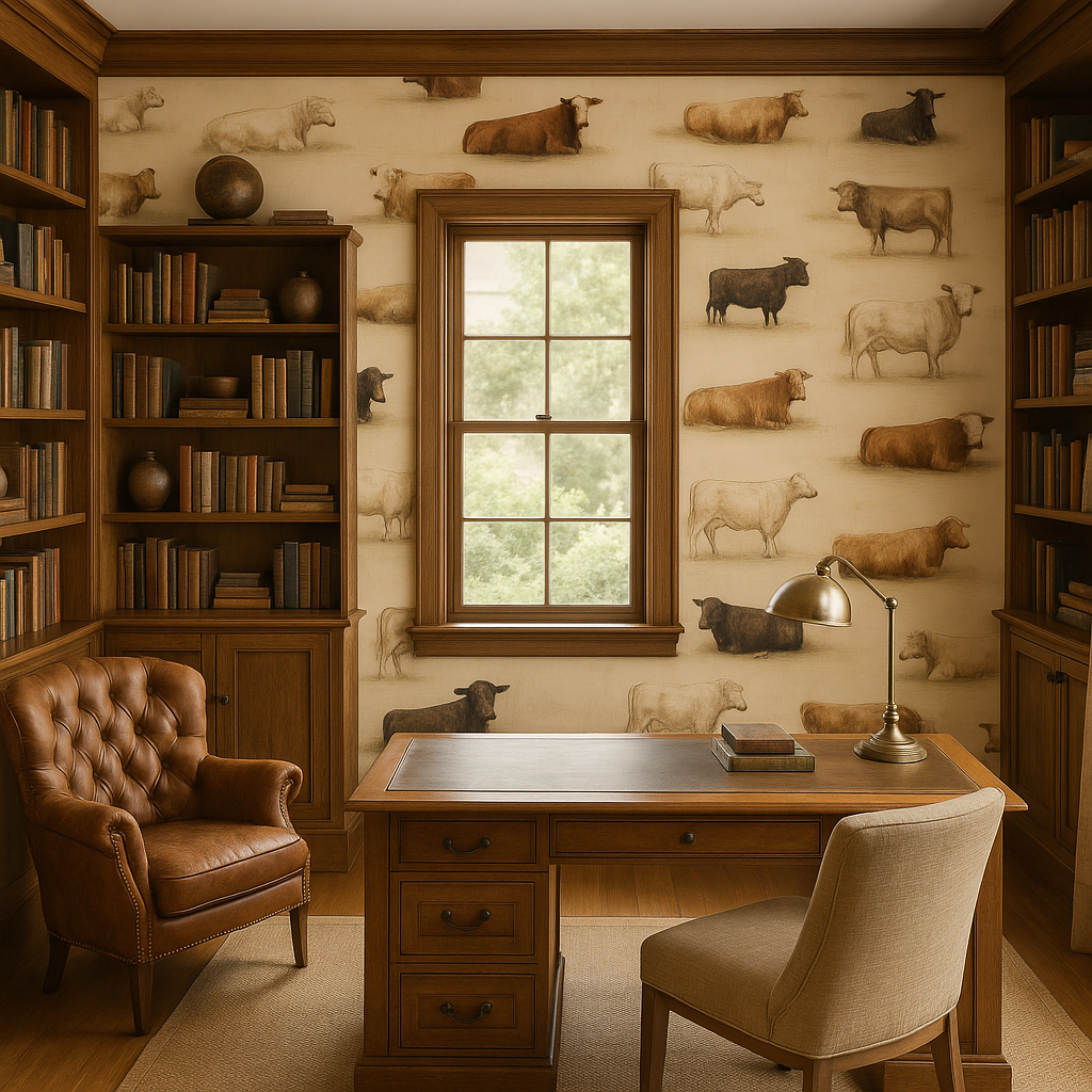 A quiet ode to the American countryside, "Pasture Portrait" features softly illustrated cows in cream, cocoa, caramel, and onyx tones, either standing or reclining in a calm, open field. The painterly strokes evoke fine oil canvas, giving this rustic wallpaper a timeless, pastoral charm. Ideal for farmhouses, guest bedrooms, or southern-style kitchens, this pattern adds authenticity, warmth, and a gentle rural rhythm to any room.
