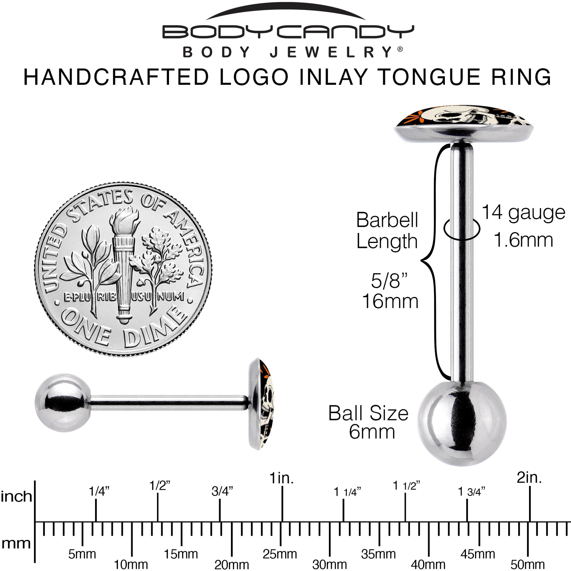 Feel the music all the way to your bones like the skeleton on this 14 gauge stainless steel tongue jewelry. It's made with a 5/8 inch 316L surgical grade stainless steel straight barbell with a 6mm bottom ball end. At center stage is a skeleton, throwing a peace sign with its bony fingers while appearing to enjoy the music. You'll be ready to bang your head while you raise the dead when you're rocking this skeleton stainless steel tongue piercing jewelry. Unique artist-drawn logo inlay design surgical steel tongue ring.