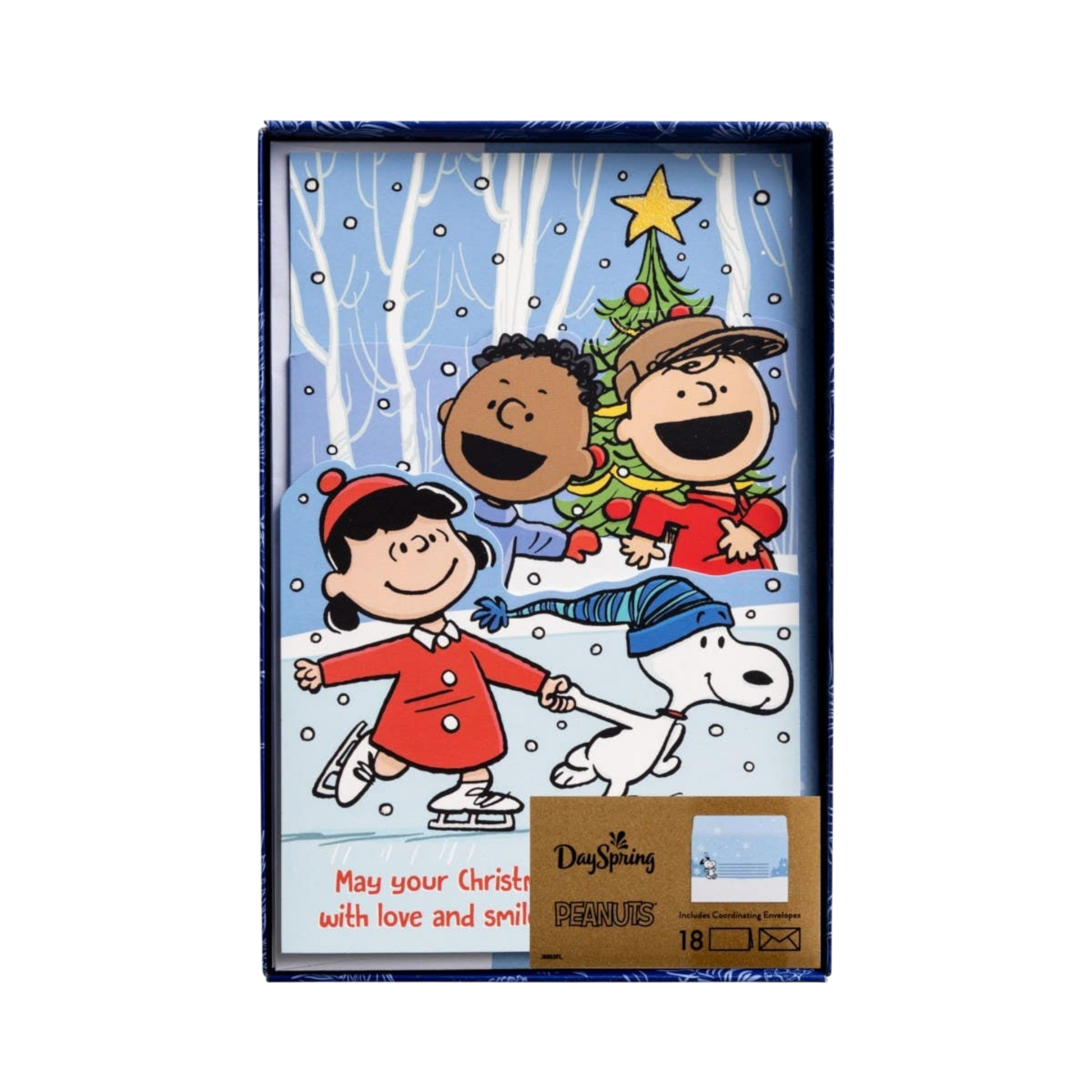 Bringing nostalgic Christmas cheer, these Ice Skating Peanuts Christmas boxed cards are a wonderful reminder of the true reason for every Christmas celebration. Featuring fun artwork with all of your favorite Peanuts characters, an inspirational Christmas message, and a Bible verse from the New King James Version Scripture text, these cards are sure to bring the joy of Christmas to all those who receive them!