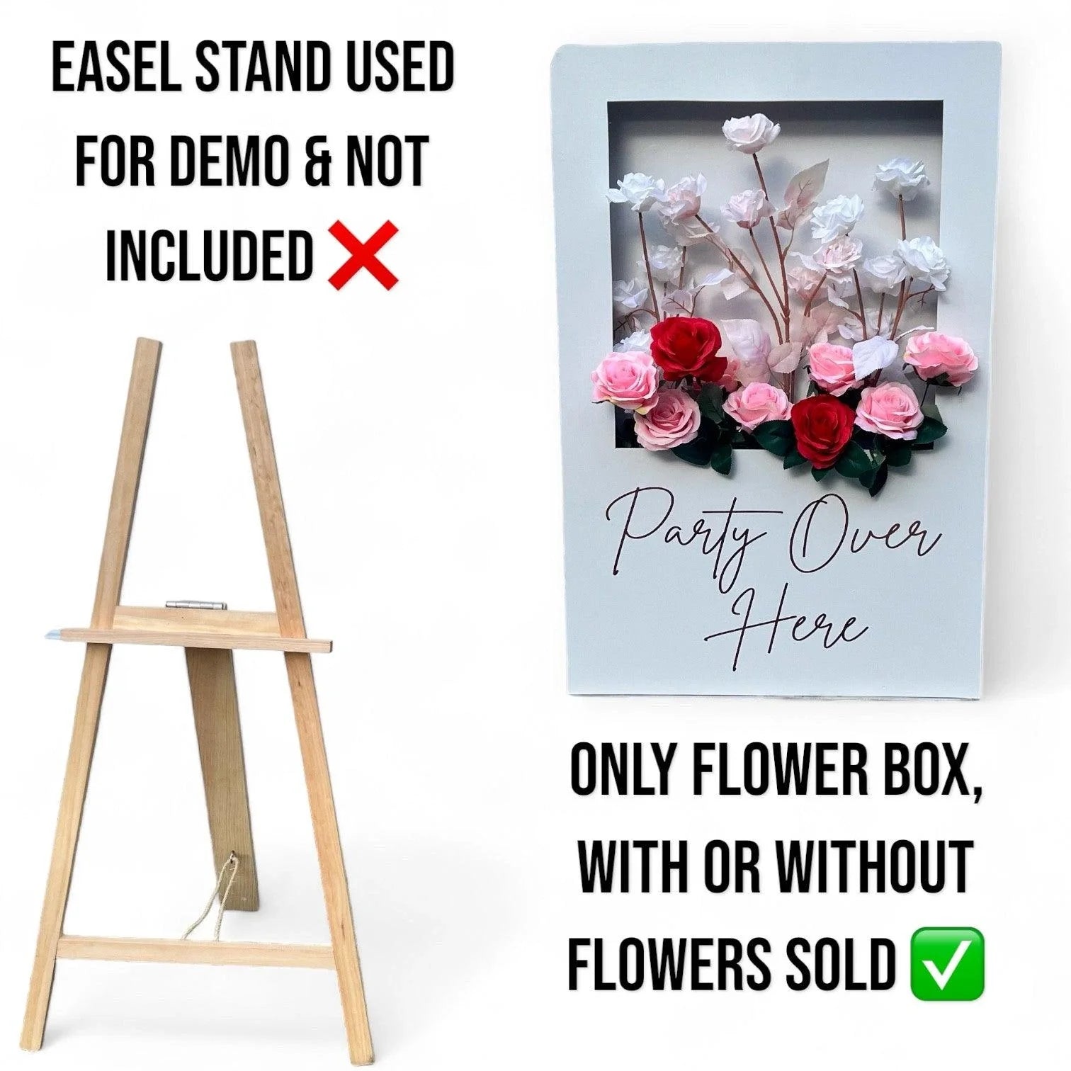 - The easel stand is used for demo purposes and not sold with the flower box. Please purchase an easel stand separately.