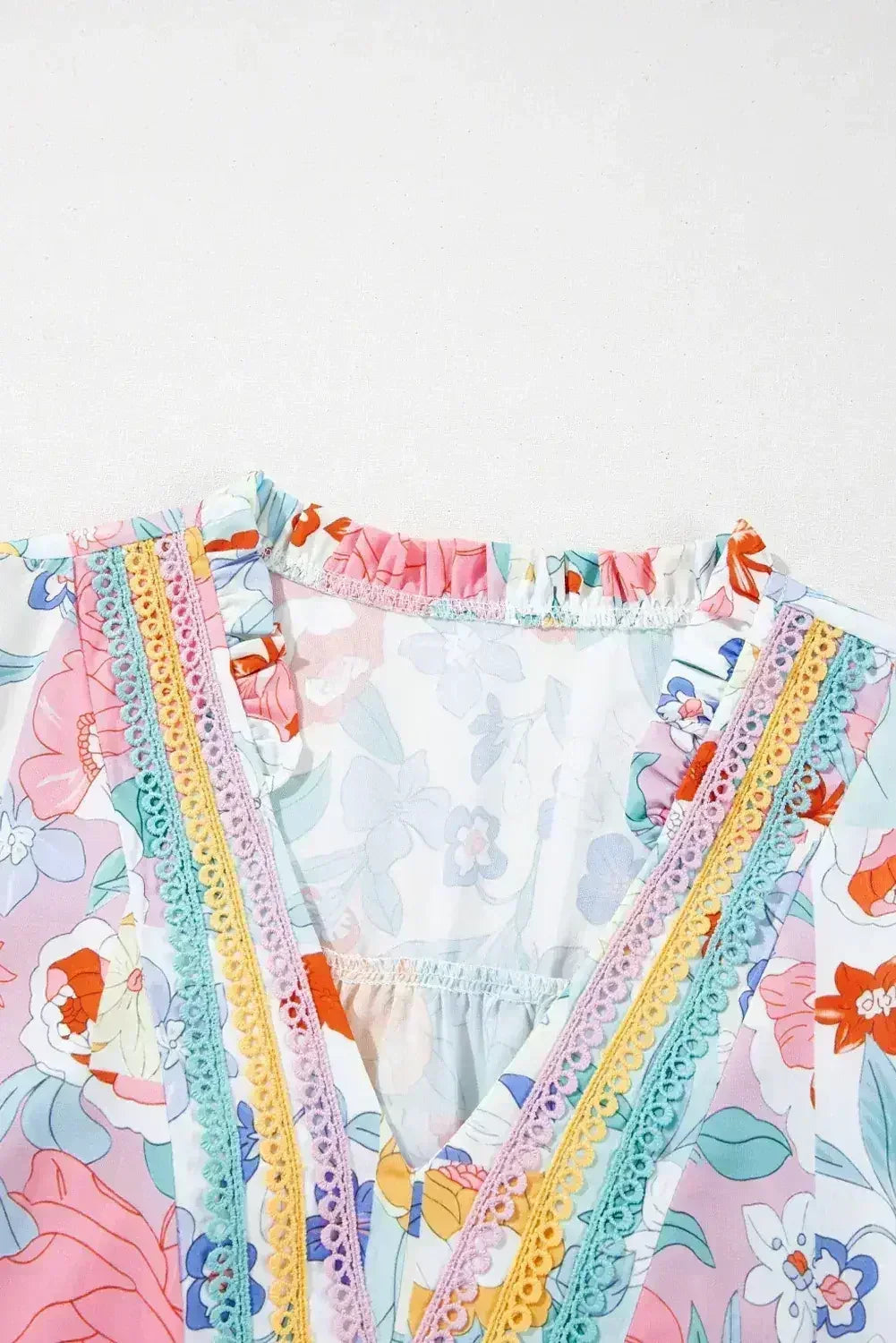 Pink Boho Flower Print Frill Neck Puff Sleeve Blouse | Femstylo