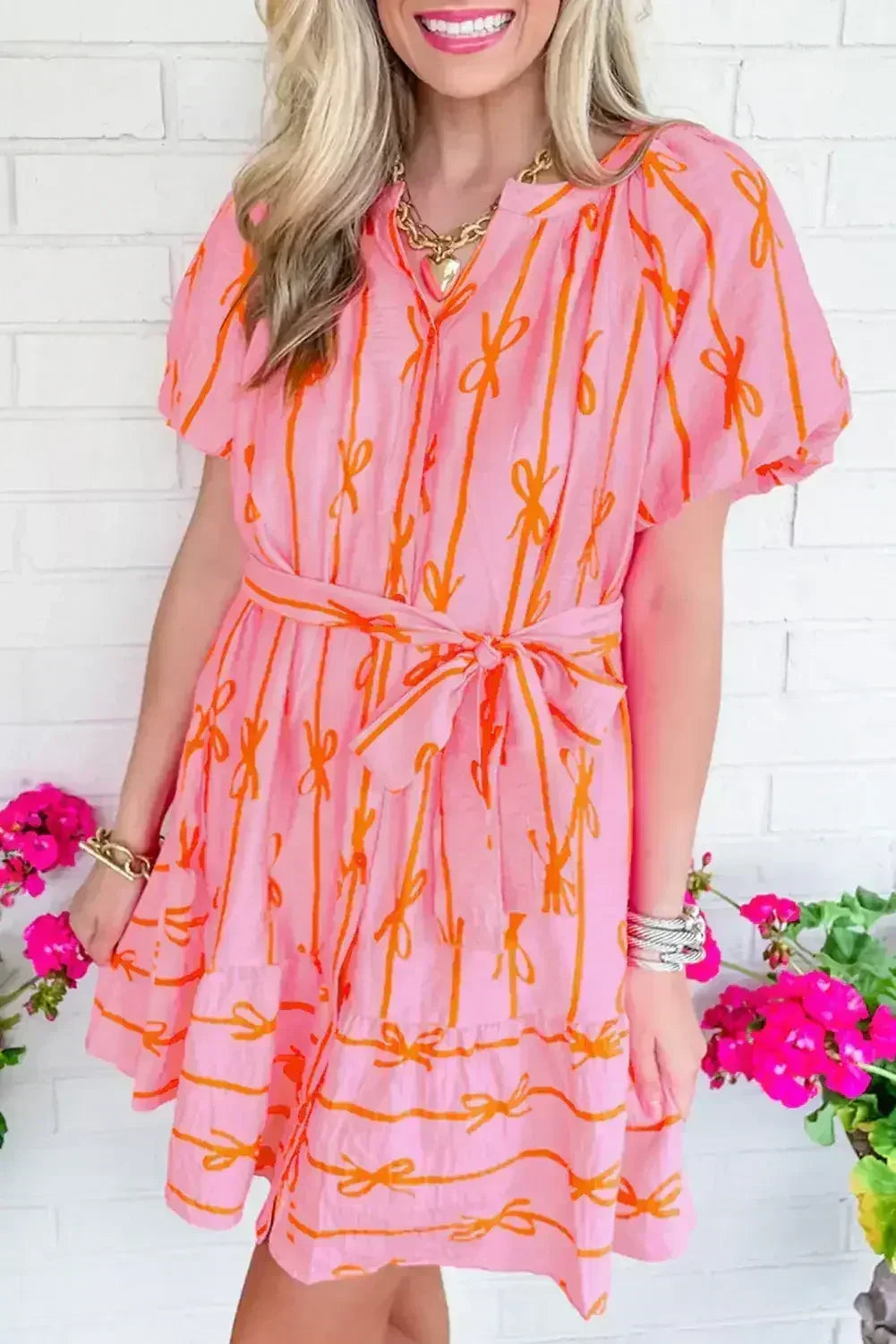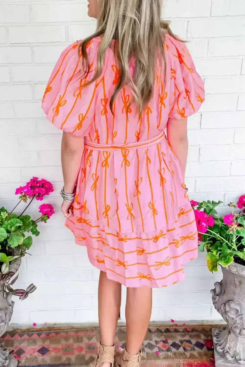 Pink Bowknot Striped Printed Bubble Sleeve Buttoned Belted Mini Dress