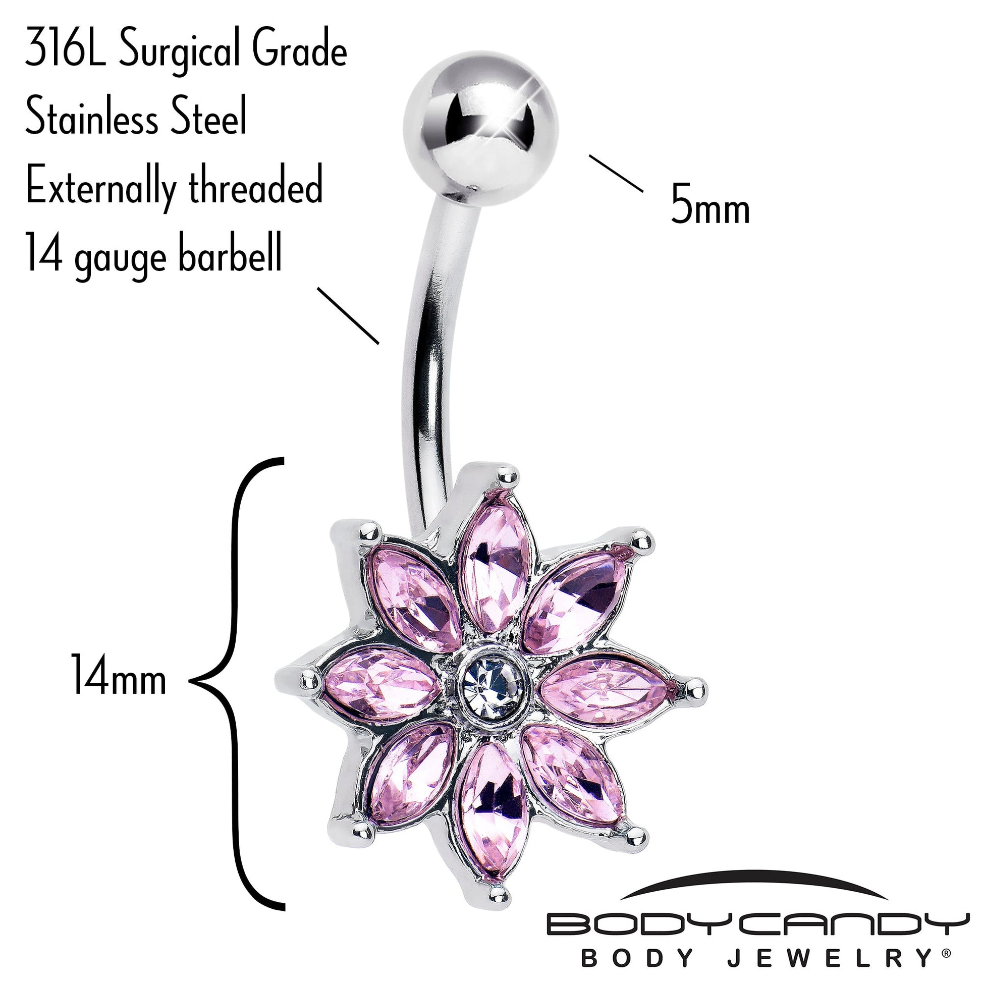 The flower on this 14 gauge navel ring is sure to make your heart bloom. It is made with a 3/8 inch 316L surgical grade stainless steel curved barbell with a 5mm top ball end. The bottom end features an intricate floral charm composed of pink gem petals for an elegant look. It is further embellished with a clear gem center in for a powerful punch of style. Let a blooming flower spruce up your look with this sweetly elegant belly piercing jewelry.Specifications