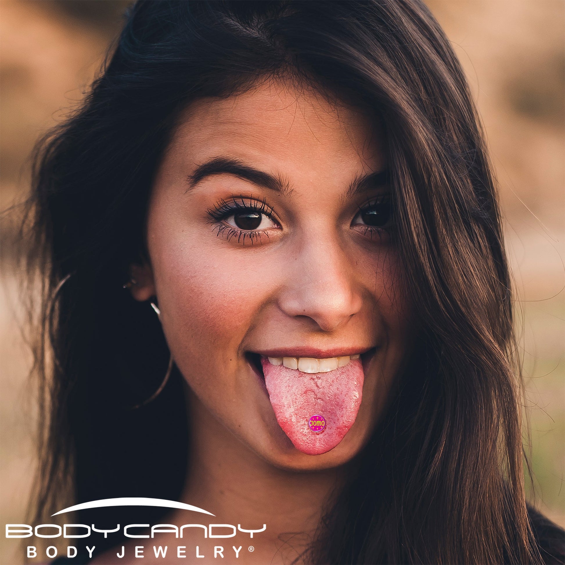 You know you're not missing out on anything so tell the world with this 14 gauge tongue barbell. It's made with a 5/8 inch 316L surgical grade stainless steel straight barbell with a 6mm bottom ball end. The top end features a pink disc logo charm with yellow star embellishments. In the center is the acronym JOMO in matching yellow script for a look that's both whimsical and stylish. You won't be missing out on colorful fashion when you're rocking this colorful tongue piercing jewelry.