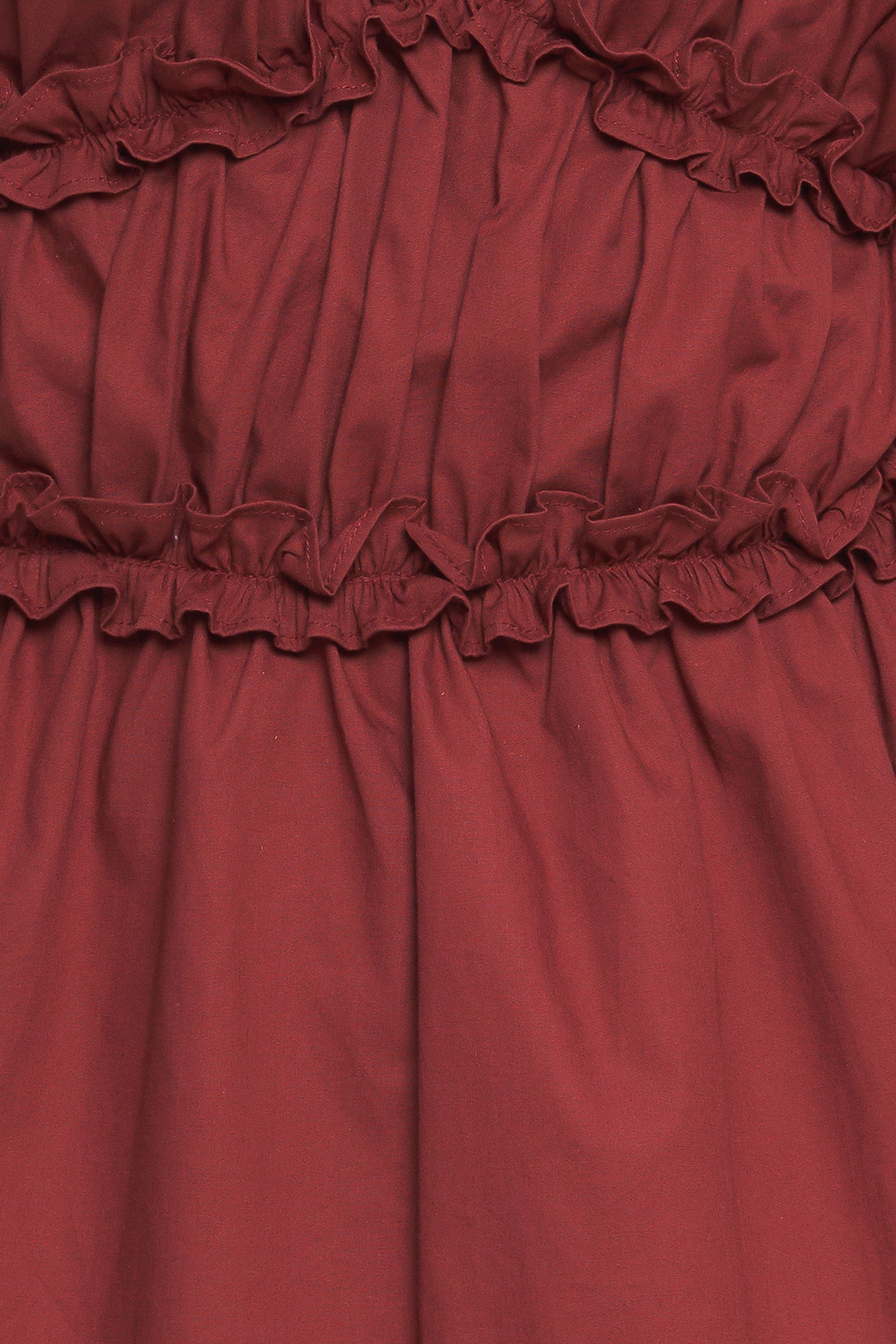 A solid woven mini dress featuring round neckline, short puff sleeve, ruffled hemline and smocked back waist band with button closure